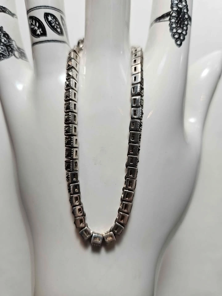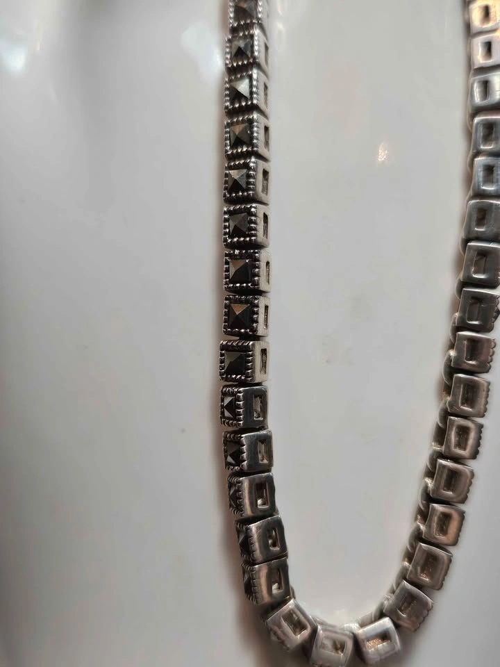 Stylish sterling silver bracelet featuring detailed links set with dark/black stones, giving it a bold vintage look. The design has a mix of geometric and textured elements that really stand out.