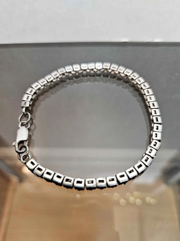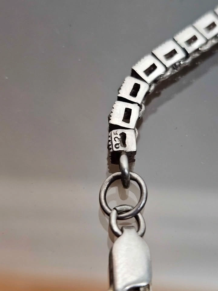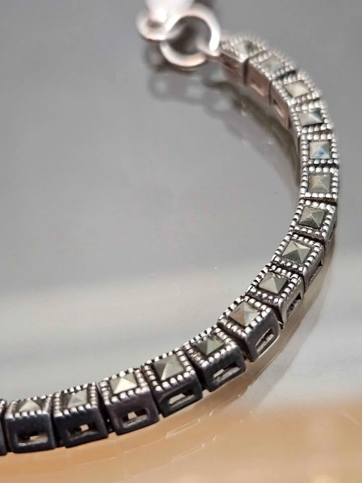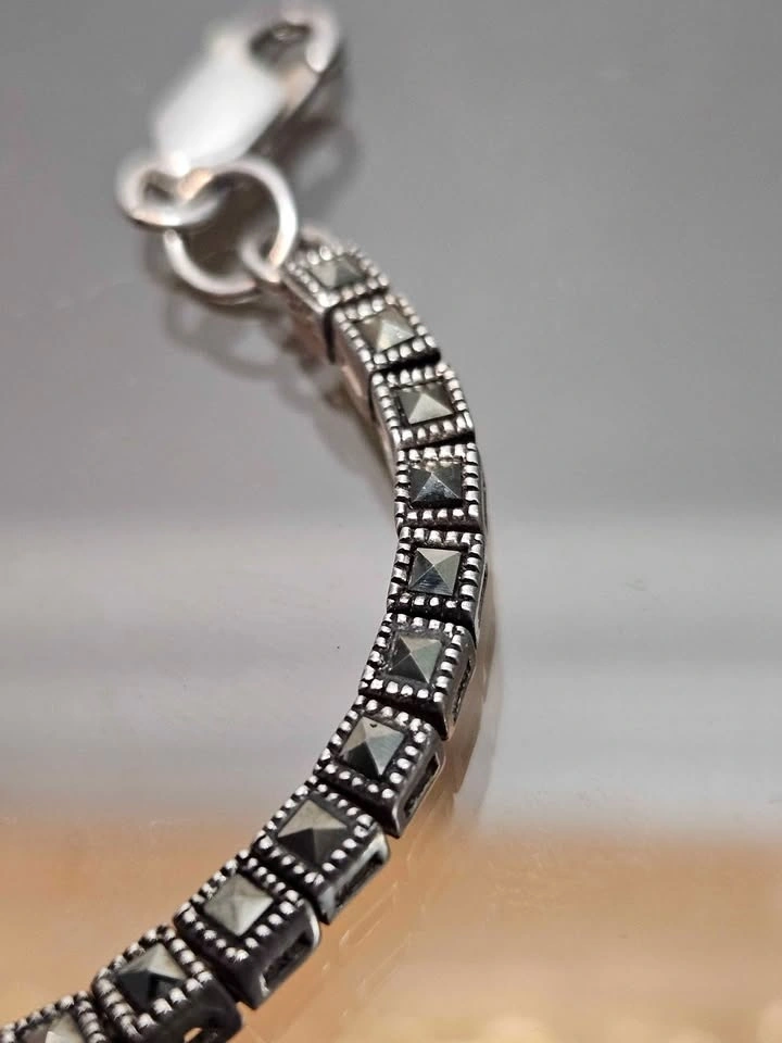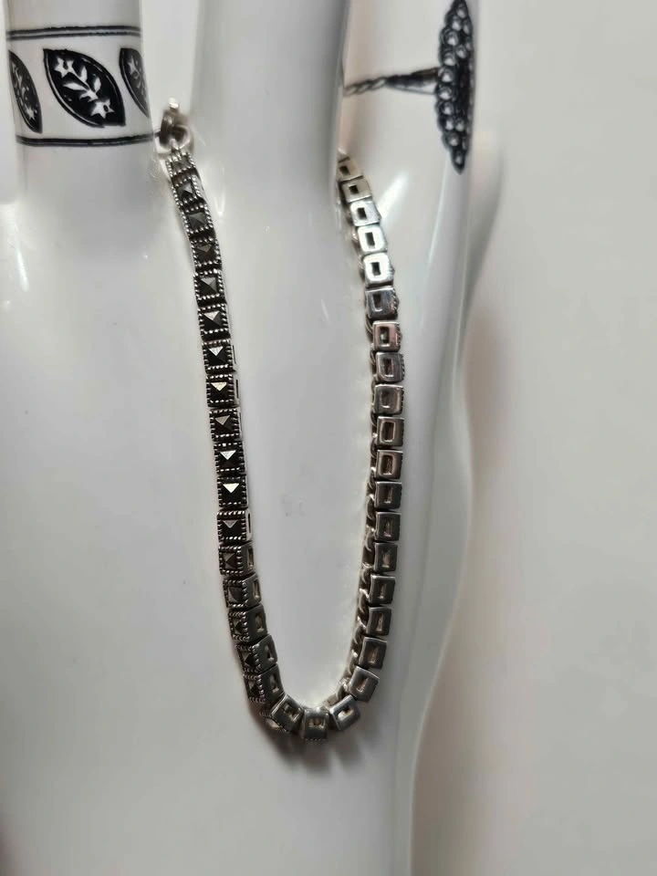 Stylish sterling silver bracelet featuring detailed links set with dark/black stones, giving it a bold vintage look. The design has a mix of geometric and textured elements that really stand out.