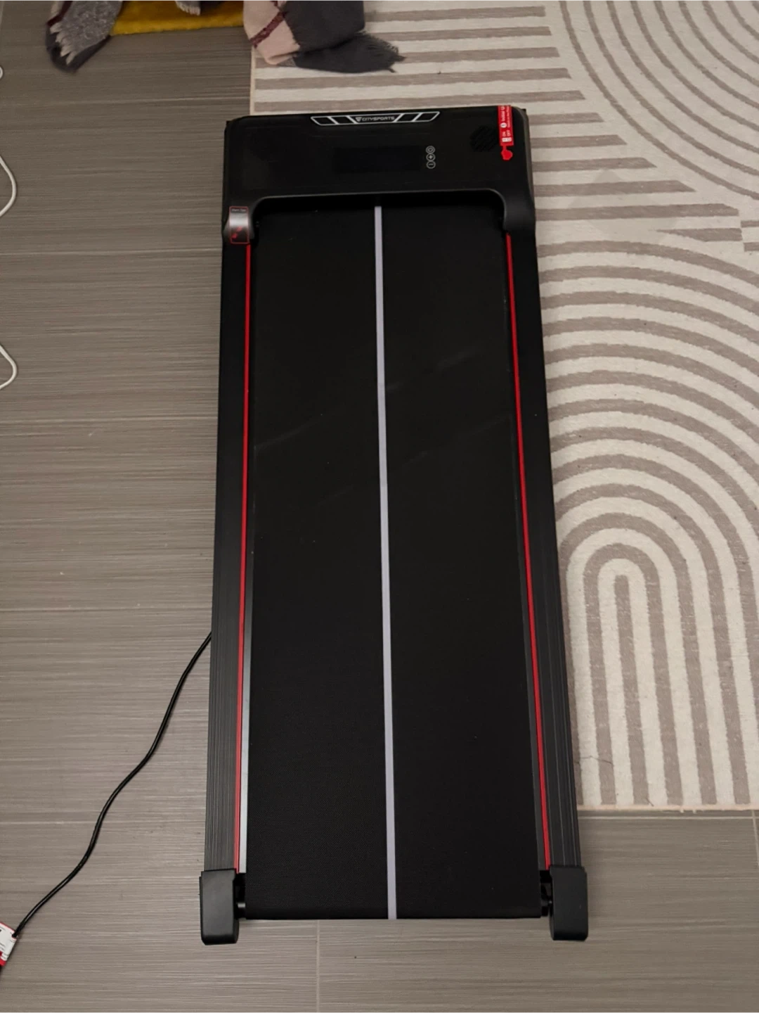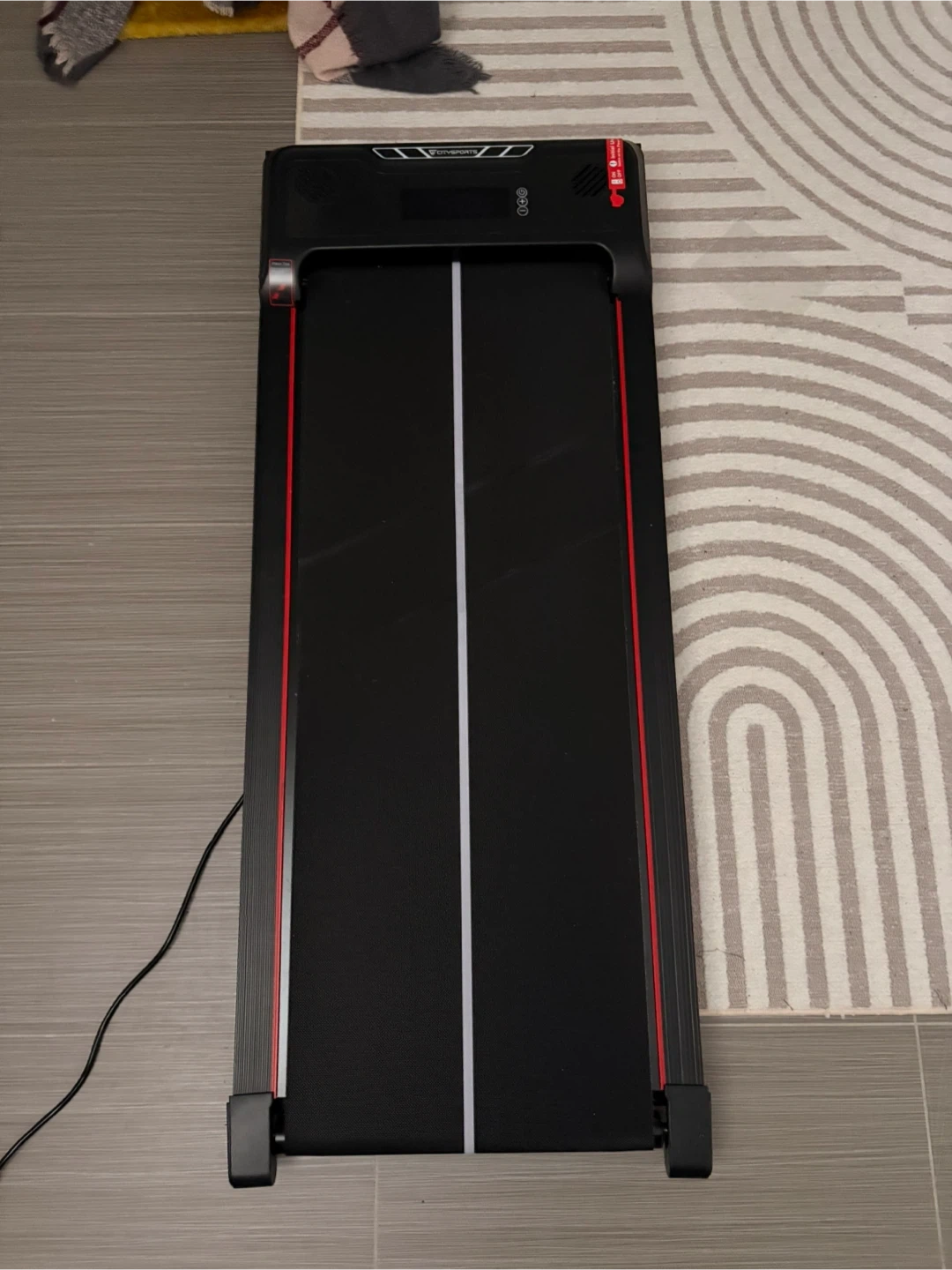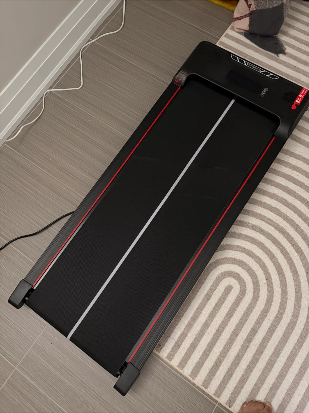 This walking treadmill is designed for compact spaces. It has a black finish with red and white accents on the belt. The console at the top displays speed and other metrics.