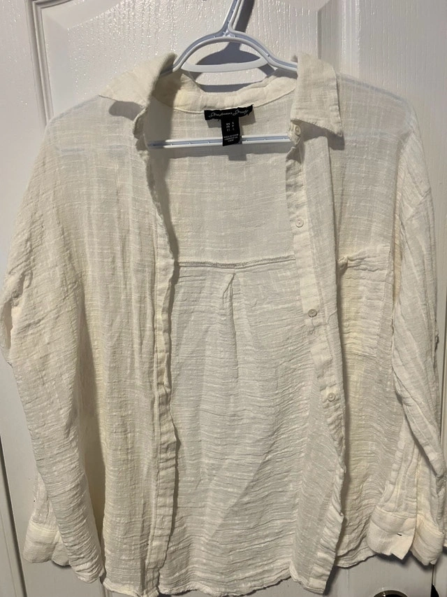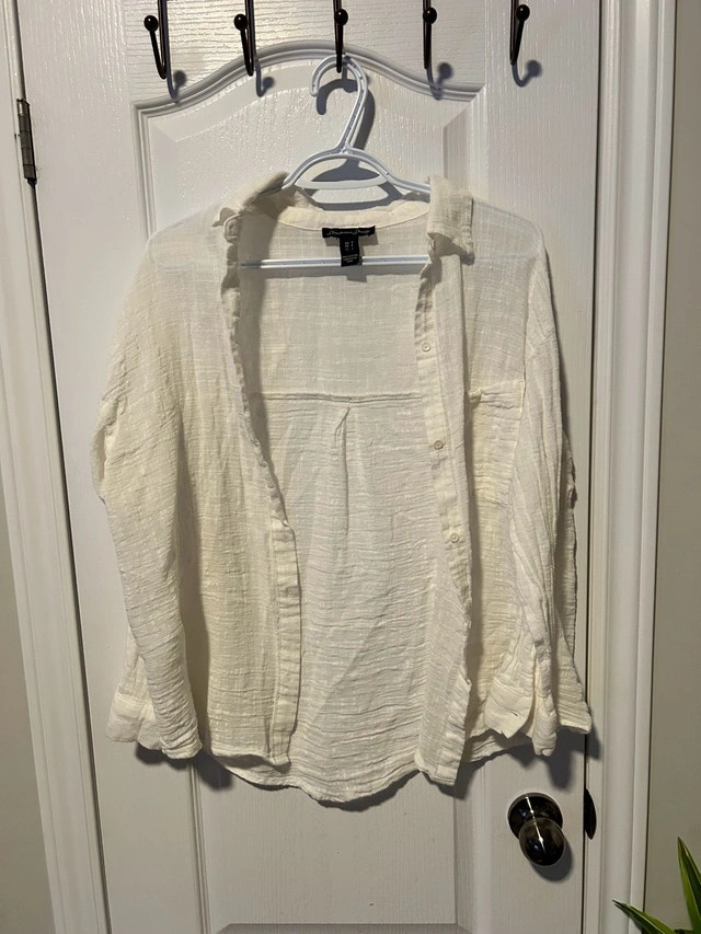 This is a used Forever 21 women's size small button-up shirt. It's made of a lightweight, breathable fabric, perfect for layering or wearing on its own. Still in great condition. Brand: Forever 21, Size: Small, Colour: White, Material: Lightweight fabric, Style: Button-up.