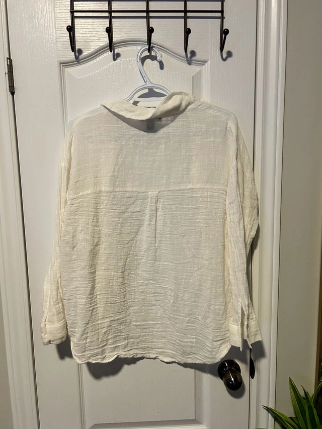 This is a used Forever 21 women's size small button-up shirt. It's made of a lightweight, breathable fabric, perfect for layering or wearing on its own. Still in great condition. Brand: Forever 21, Size: Small, Colour: White, Material: Lightweight fabric, Style: Button-up.