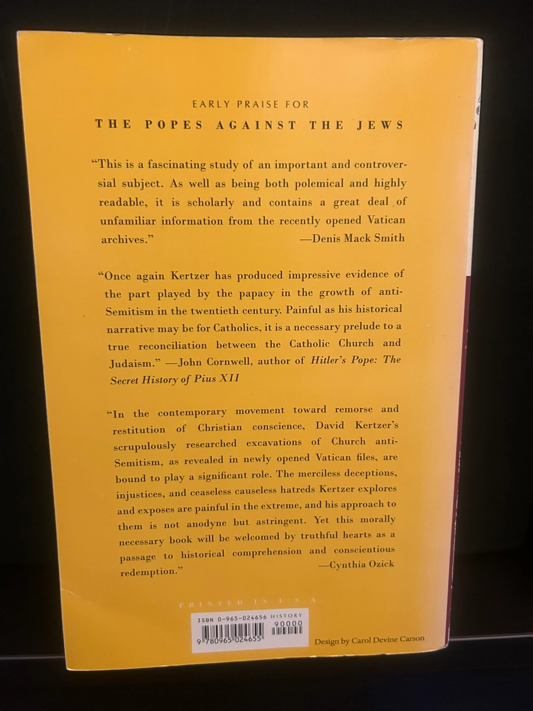 Selling a copy of "The Popes Against the Jews: The Vatican's Role in the Rise of Modern Anti-Semitism" by David I. Kertzer.