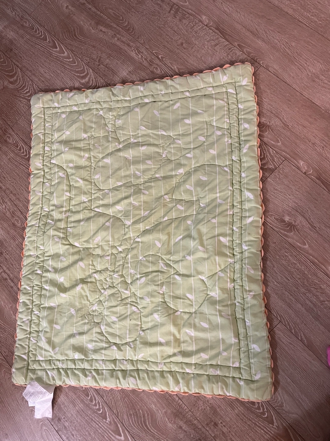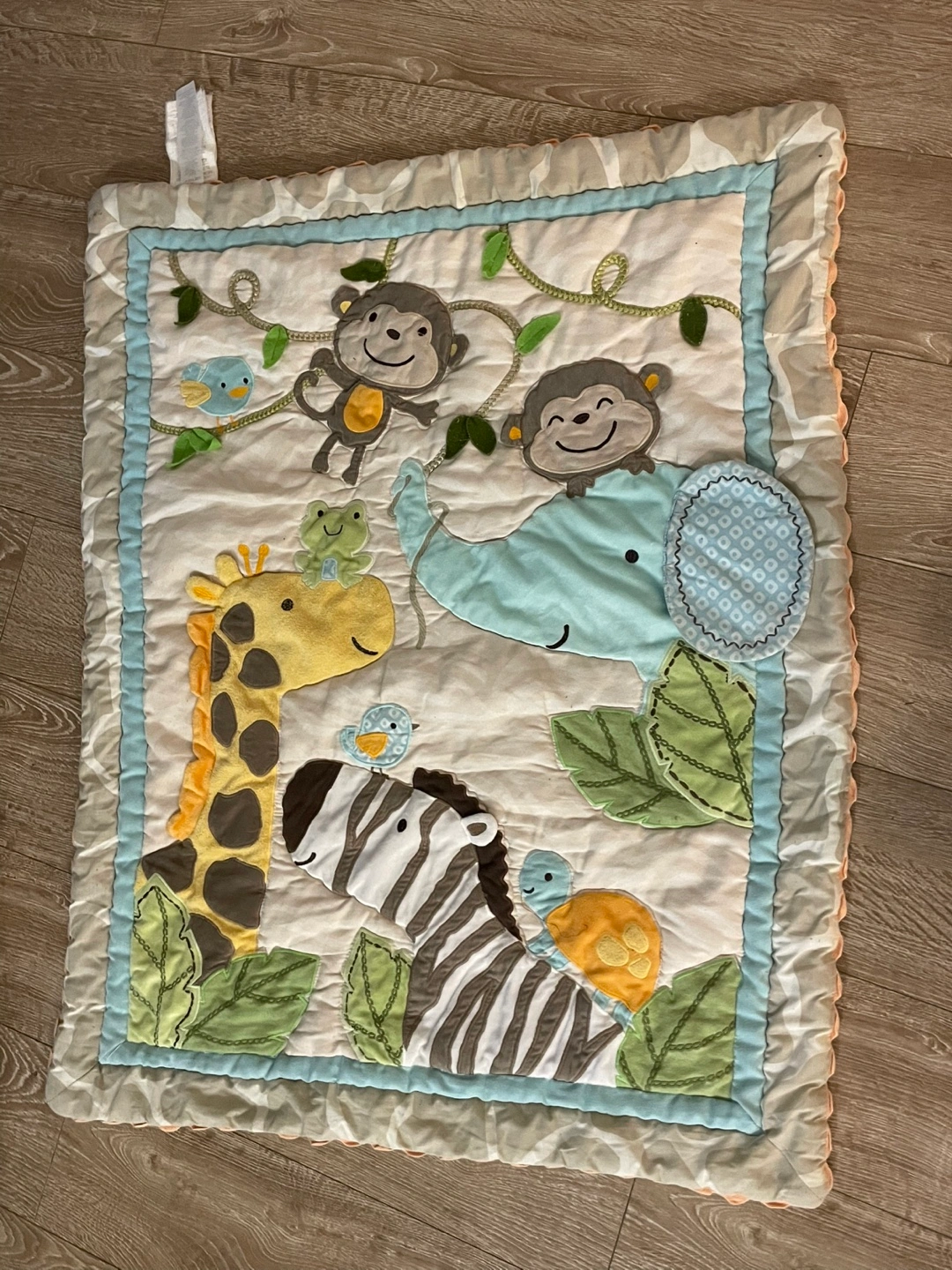 One adorable baby playmate. features a pastel green leaf design, the front has a jungle theme with appliqued animalsu. have scalloped edges. Pre-loved condition.
