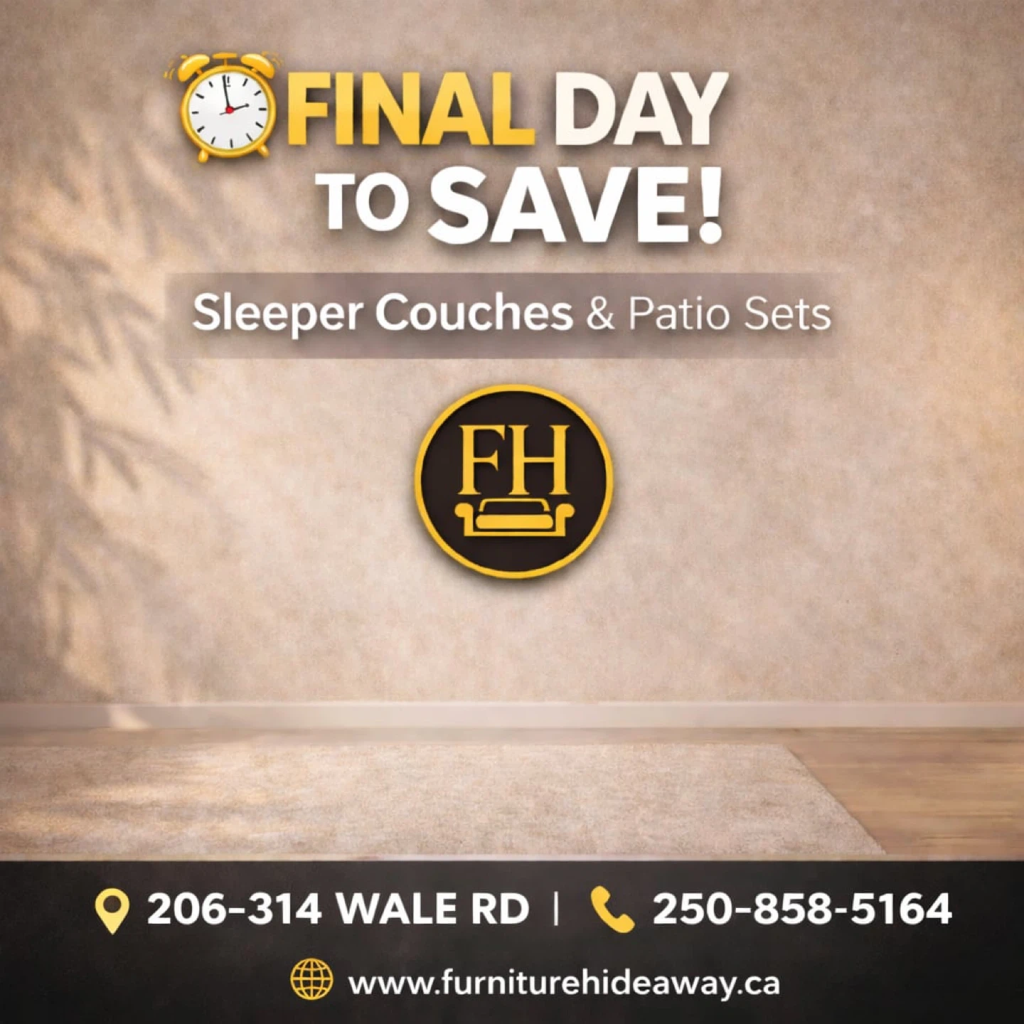 LDon’t miss the lowest prices on our Patio Sets and Sleeper Sofas! Perfect time to upgrade your patio or living room before the deals are gone! ✨ Luxe Patio Set with Fire Table – $1,899 ✨ Luxe Patio Set (without Fire Table) – $1,299 ✨ Eva Patio Set – $929 ✨ Roxy Patio Set – $1,349 ✨ Taylor Sleeper Sofa Set – $2,199 🔥 Lots of amazing deals waiting for you! Come visit our showroom today and let our team assist you. 📍 Visit Our Showrooms: Victoria & Nanaimo, BC 🌐 Website: www.furniturehideaway.ca ⏳ Sale Ends today! #FurnitureSale #FinalDaySale #PatioSeason #SleeperSofa #FurnitureDeals #FurnitureHideaway #VictoriaBC #NanaimoBC