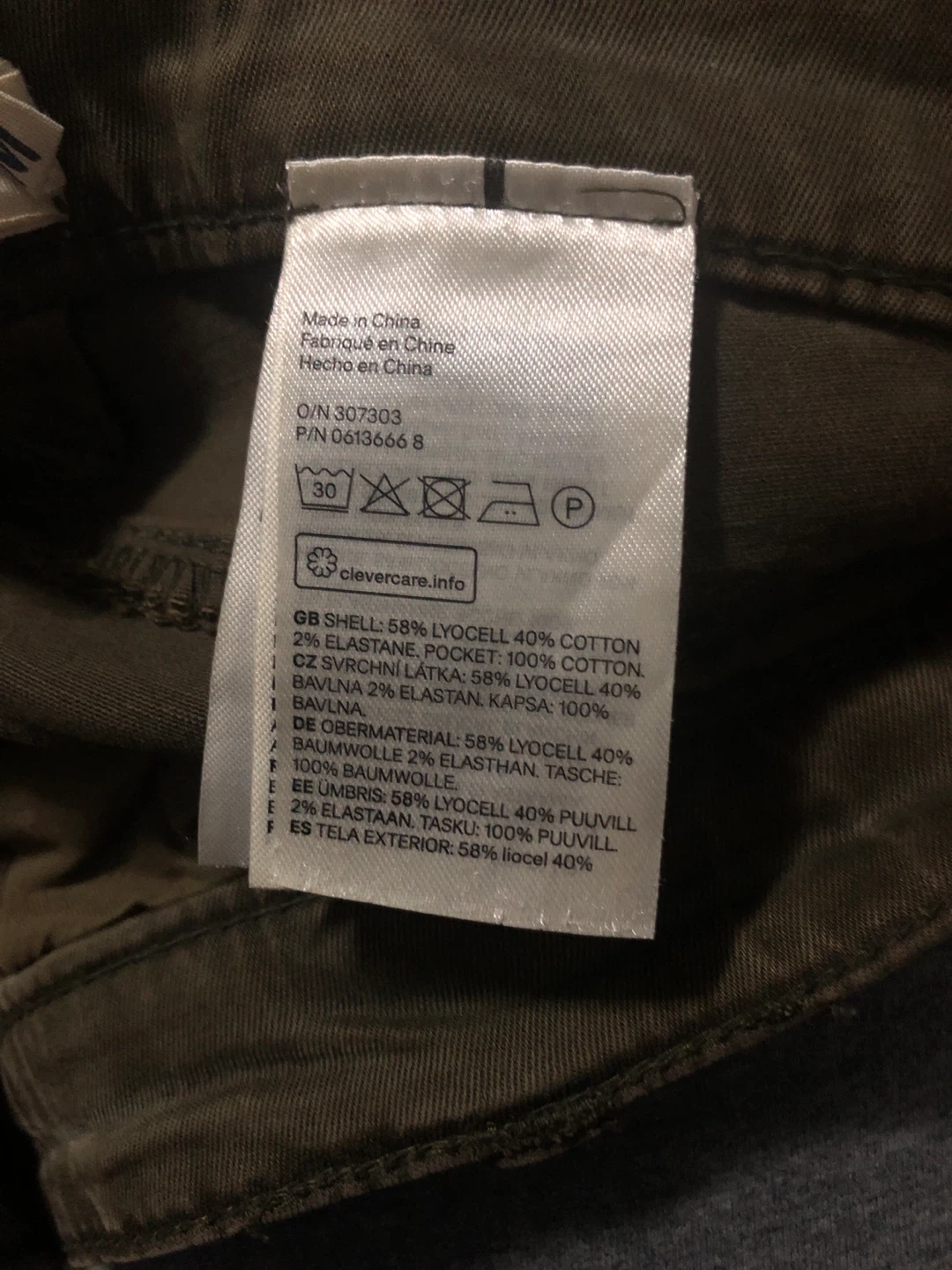 Selling a pair of L.O.G.G. cargo pants in olive green. They are a size 6 (CA size). The shell is made of 58% lyocell and 40% cotton, with 2% elastane. The pocket is 100% cotton.