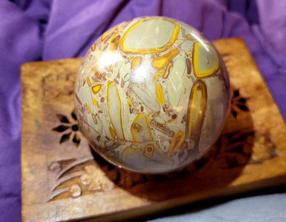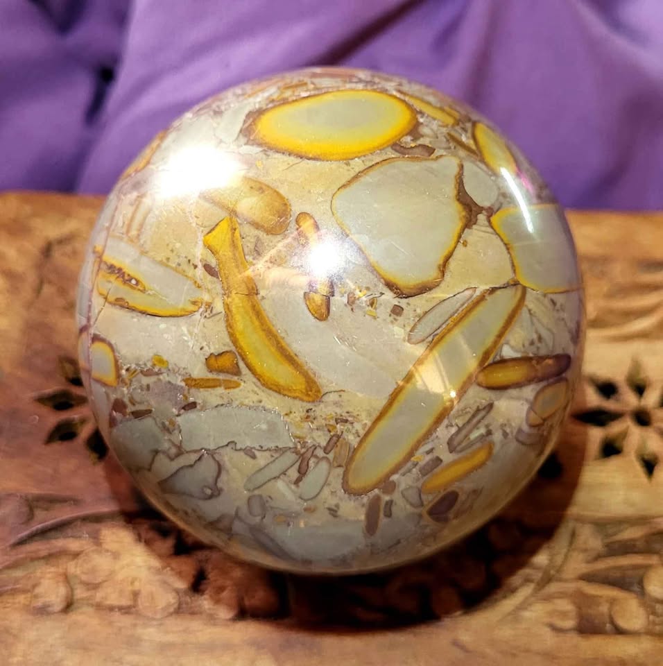 Beautiful 70mm Bamboo Jasper sphere. These are by far one of my favorite crystals. Each one is different and has their own unique pattern. Makes a nice addition to any collection. This one is a big one it's 70mm across. One only.