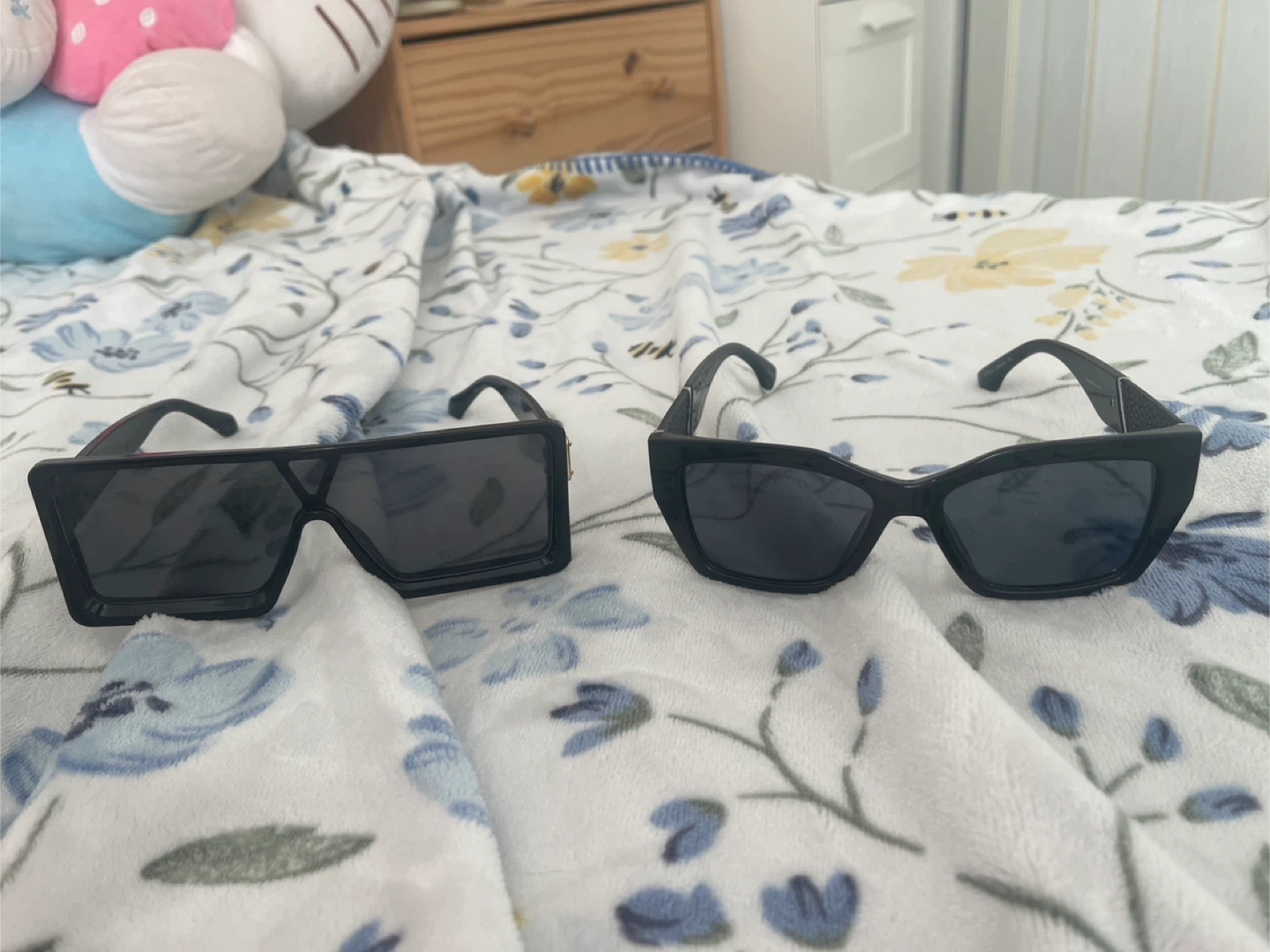 Two pairs of black fashion sunglasses are included. One pair has a rectangular, oversized frame, while the other features a more cat-eye shape. Both are made of plastic with dark lenses. Pick up cash only