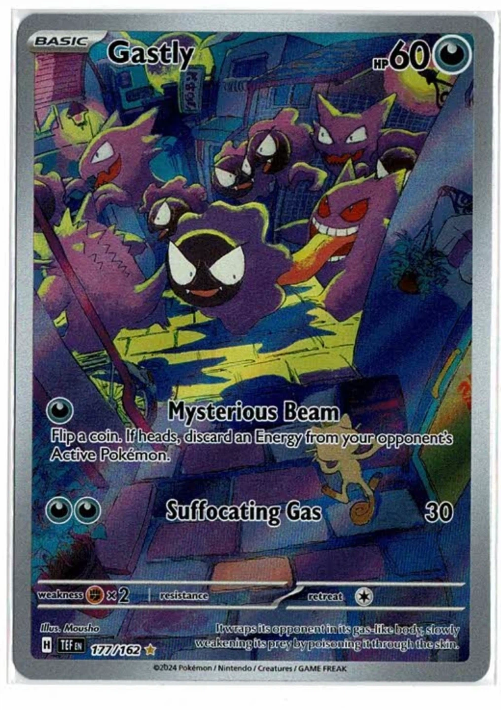 This is the Illustration Rare Gastly 177/162 from Temporal Forces. Condition is mint, freshly pulled. Would trade for sealed, zards and mewtwo for my PC.