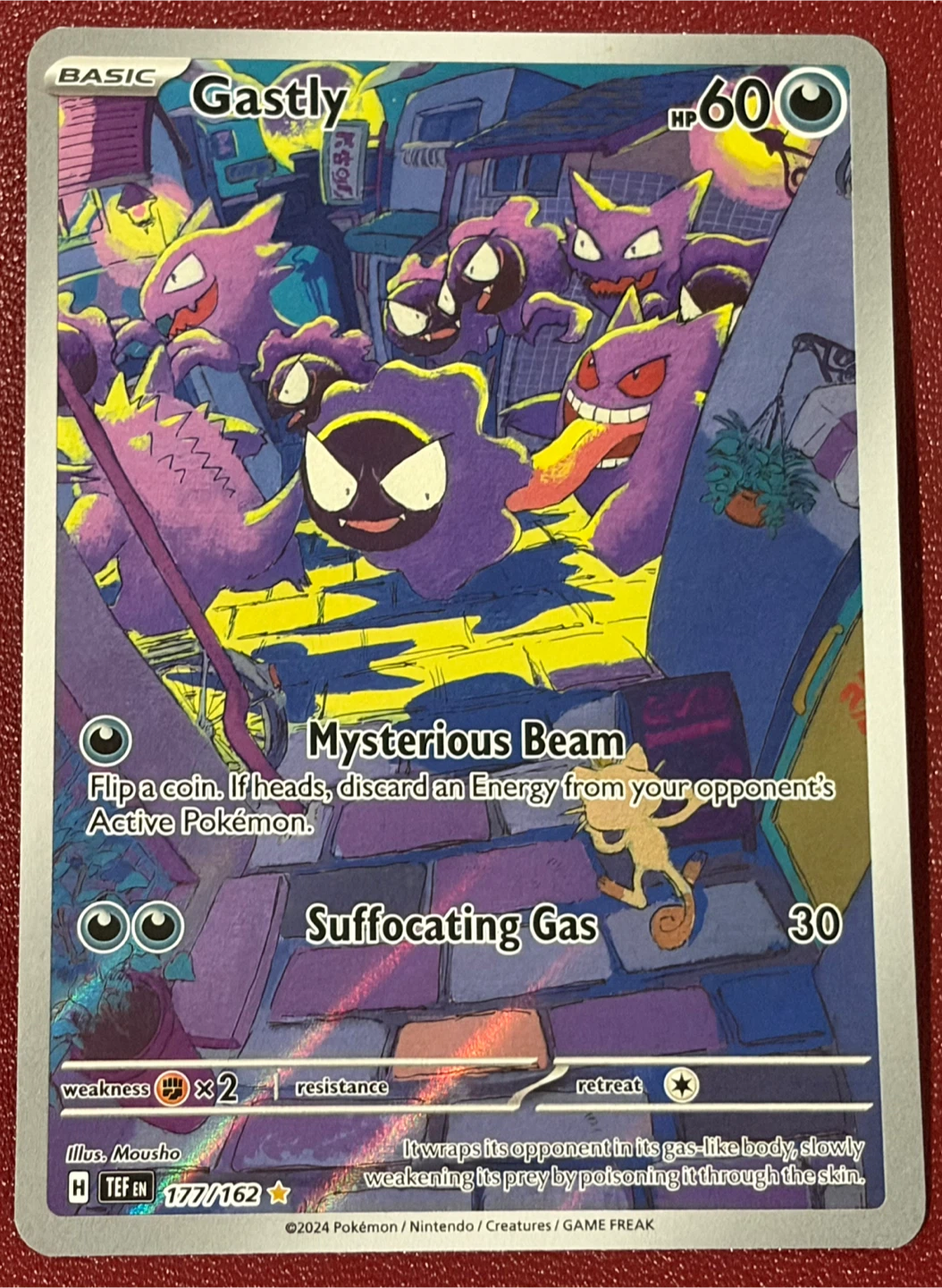 This is the Illustration Rare Gastly 177/162 from Temporal Forces. Condition is mint, freshly pulled. Would trade for sealed, zards and mewtwo for my PC.