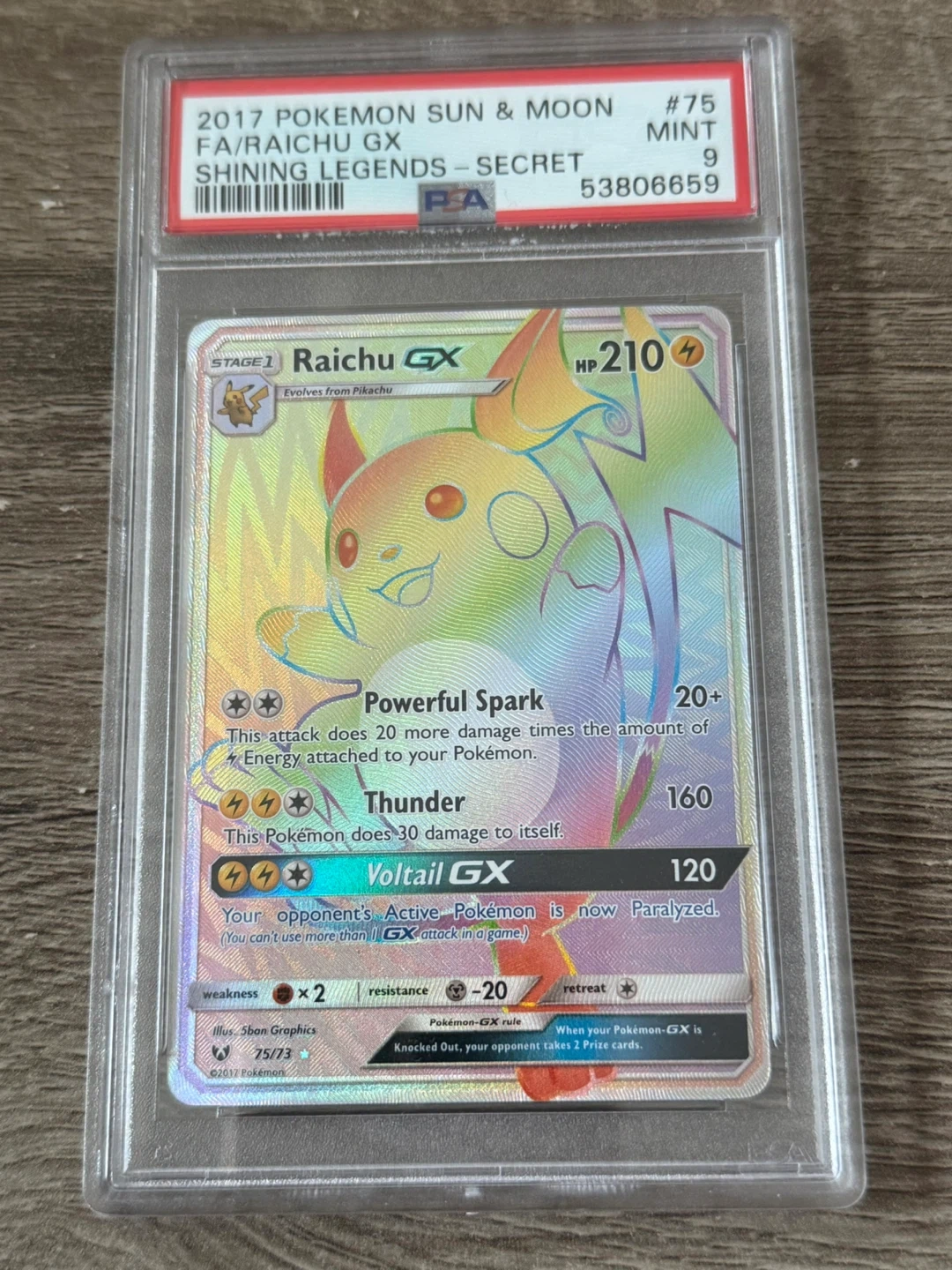 2017 Pokémon Sun & Moon FA/Raichu GX card. It's from the Shining Legends set, number 75, and is graded Mint 9 by PSA. The card has 210 HP and features the Powerful Spark and Thunder attacks. Rated a 9
