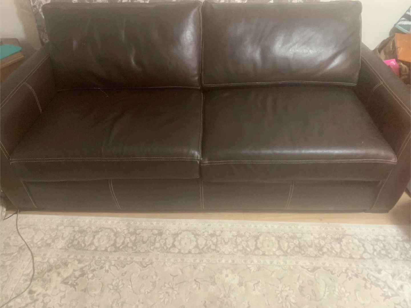 This is a dark brown leather sofa cum bed and matching armchair. Both pieces are in good condition, with some minor signs of wear consistent with normal use. The leather is a rich, deep colour. This set offers comfortable seating for your living room.it has spring double Matress and is convenient for one adult person to sleep. Easy to clean. It is heavy. Need two people and Dolly . You transport. Clean conditions . Used for a year.