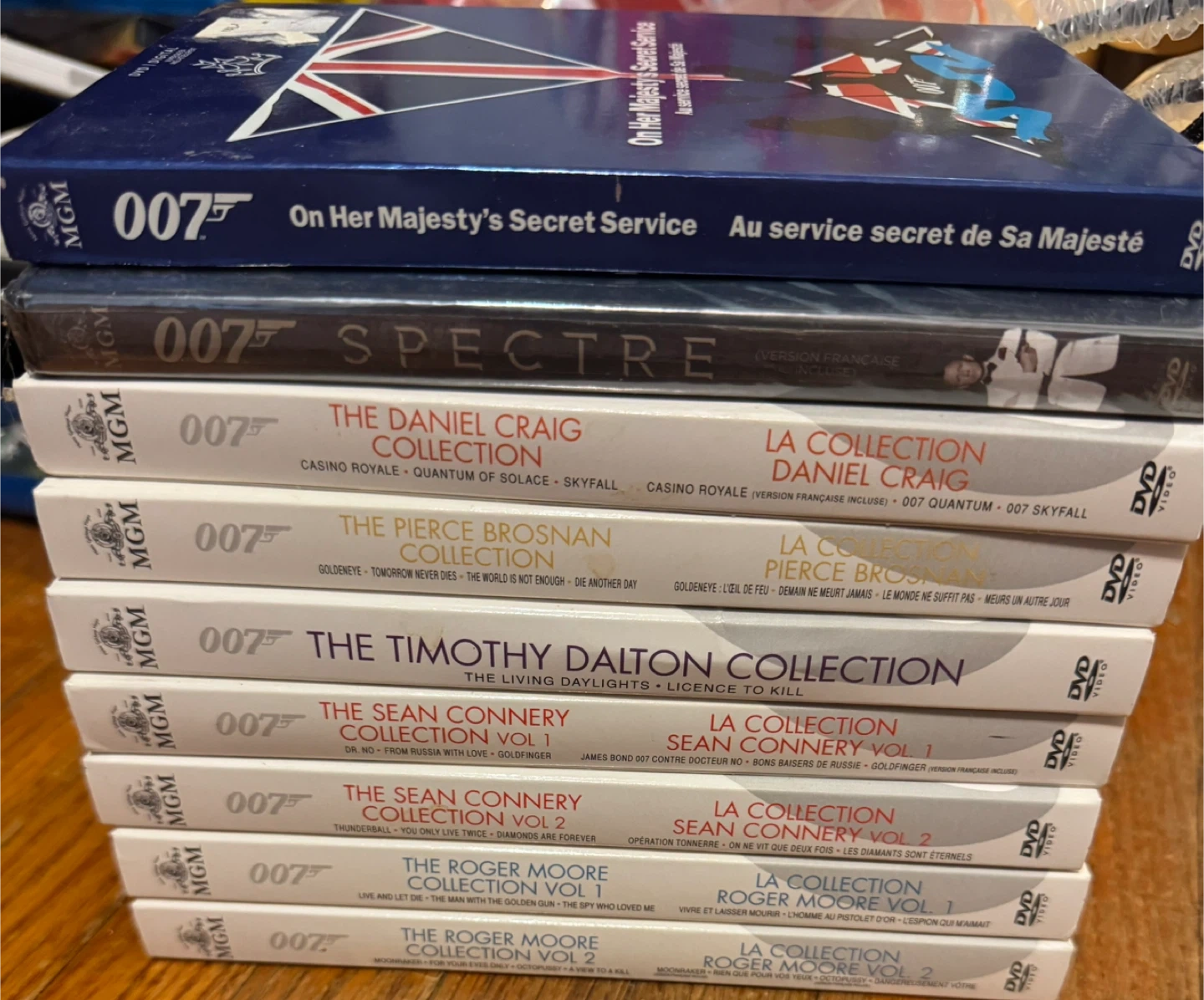 165Nearly complete collection of James Bond 007 DVDs! Includes: - On Her Majesty's Secret Service - Spectre - The Daniel Craig Collection - The Pierce Brosnan Collection - The Timothy Dalton Collection - The Sean Connery Collection Vol 1 & 2 - The Roger Moore Collection Vol 1 & 2 Opened but unwatched Cat friendly home Pick up only at Greenwood and Gerrard aves Please browse profile for other movies or ask if you’re looking for something specific. Willing to bundle deals