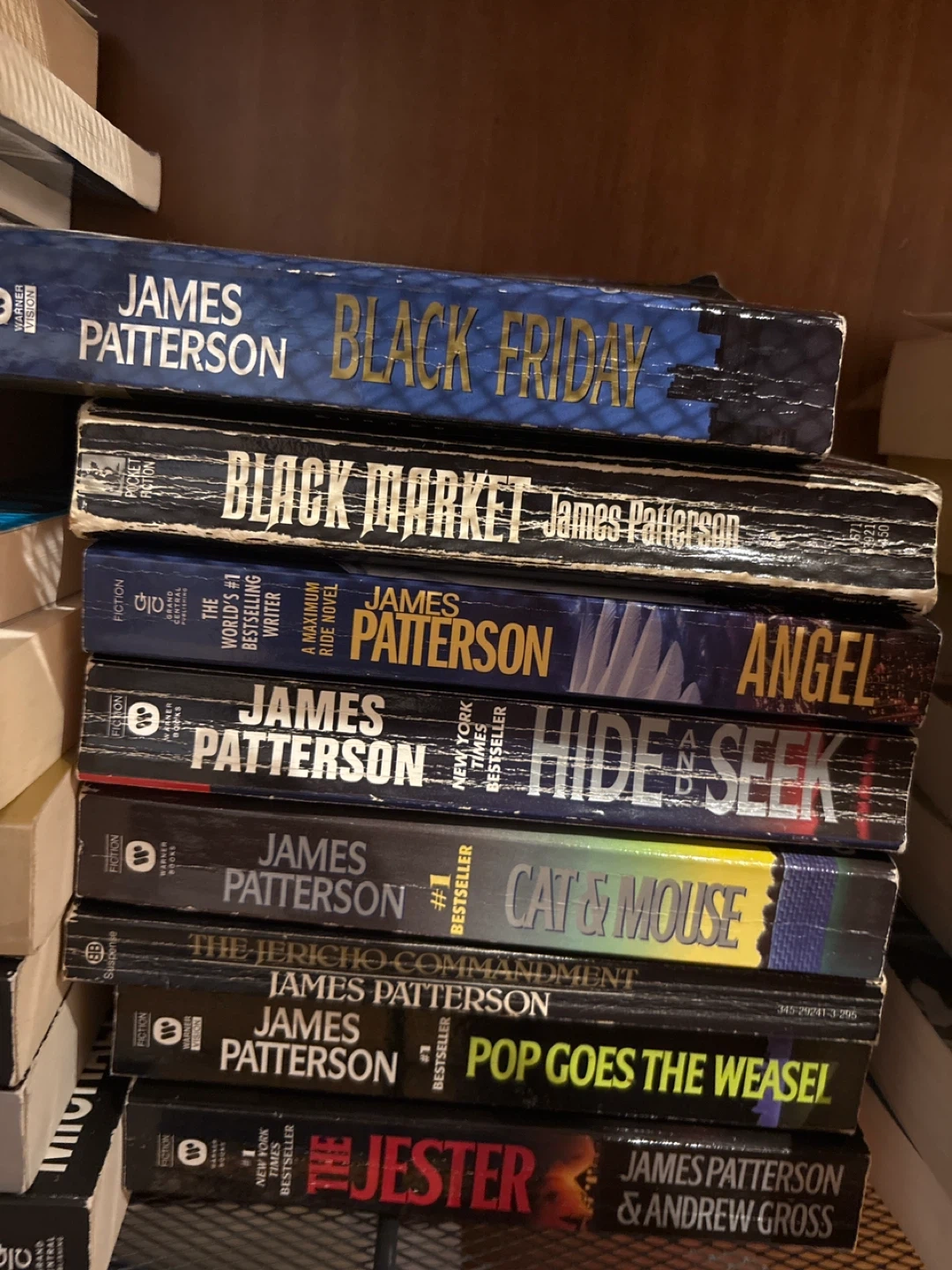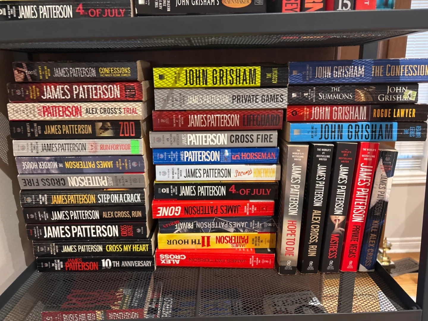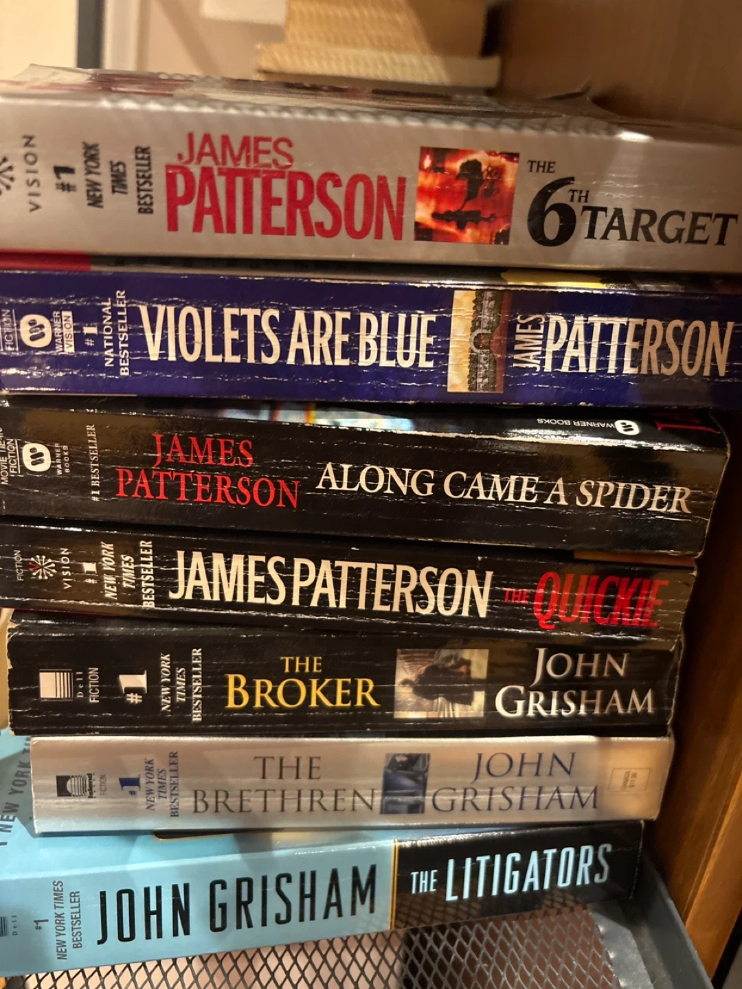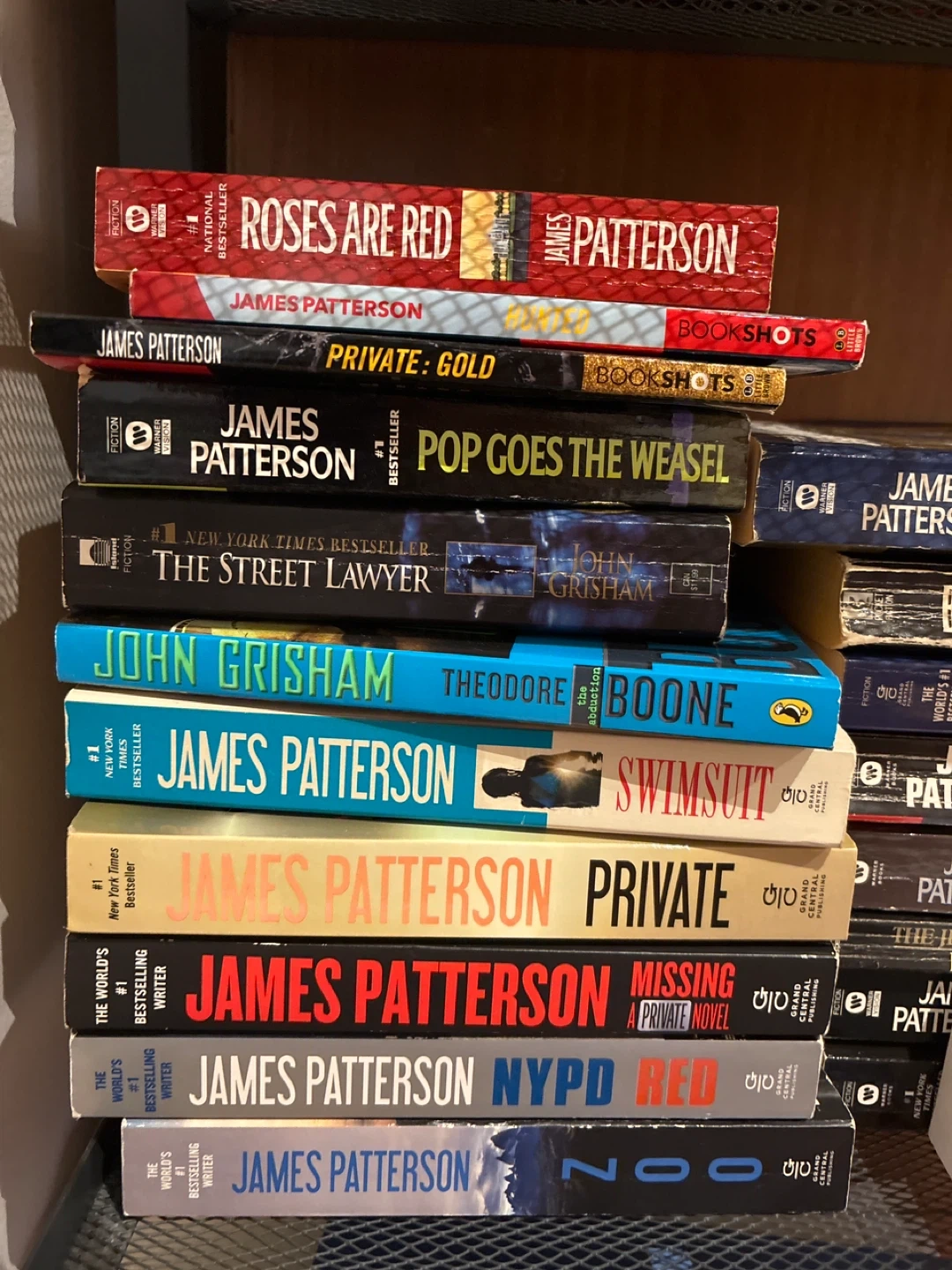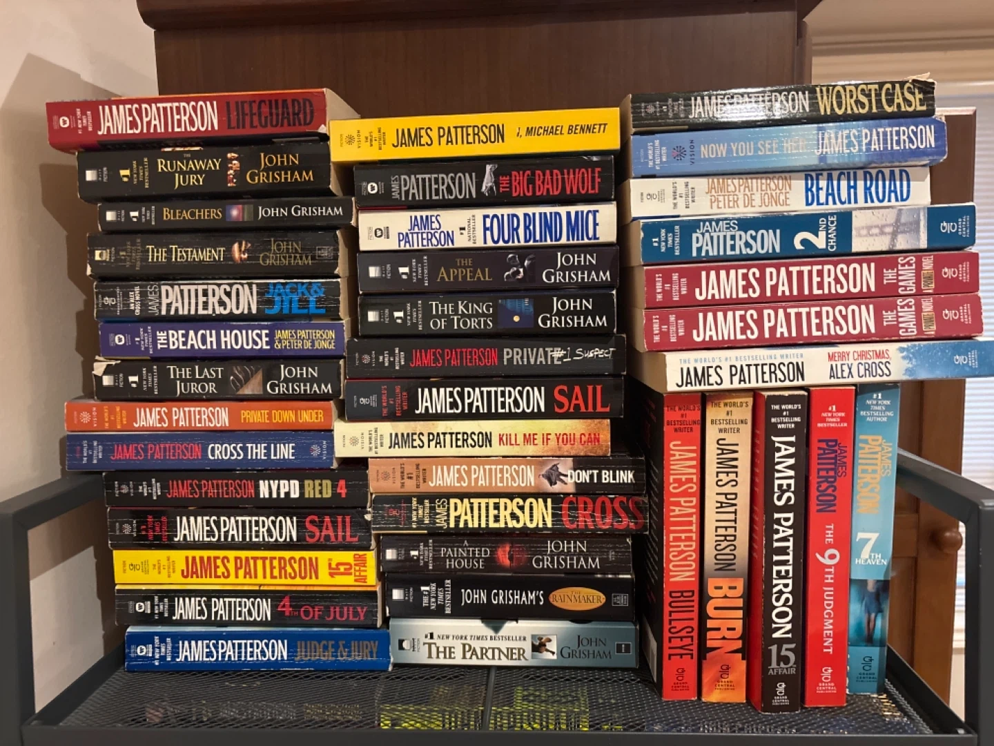 Selling a collection of books by James Patterson and John Grisham. Titles include Black Friday, Angel, Hide & Seek, Cat & Mouse, Pop Goes the Weasel, Roses are Red, The Street Lawyer, Theodore Boone, Swimsuit, NYPD Red, Zoo, Lifeguard, The Big Bad Wolf, Four Blind Mice, Beach Road, The Partner, The 6th Target, Violets are Blue, Along Came a Spider, The Quickie, The Broker, The Litigators, and more! Great for any thriller or legal fiction fan!