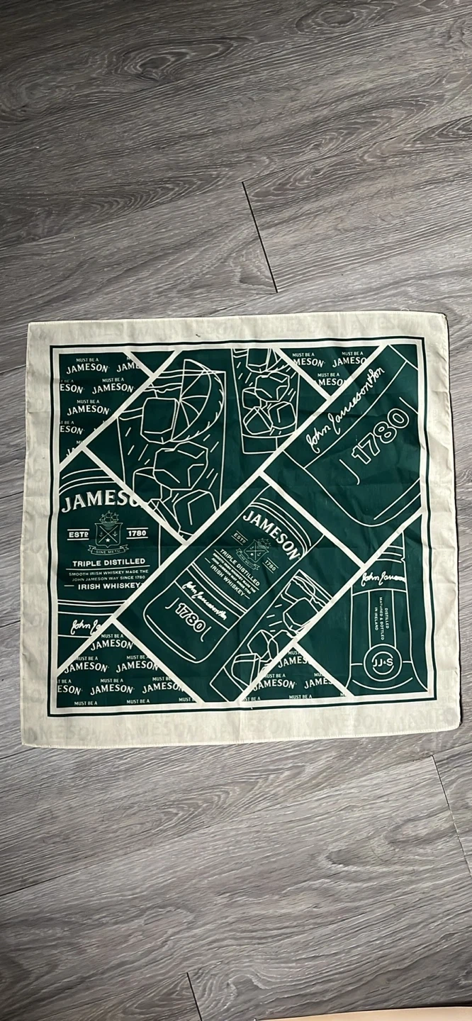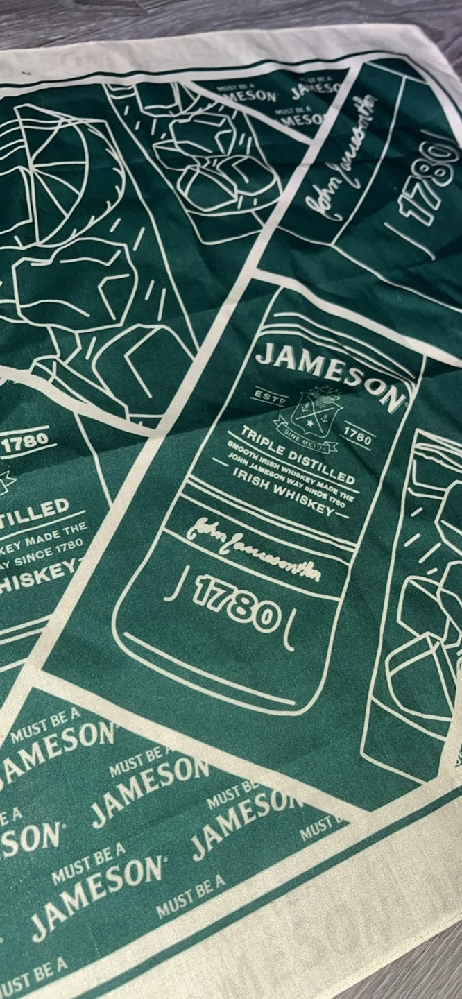 Cool Jameson Irish Whiskey wall decor! It features a green and white design with illustrations of the Jameson bottle and logo. Cloth-type material.
