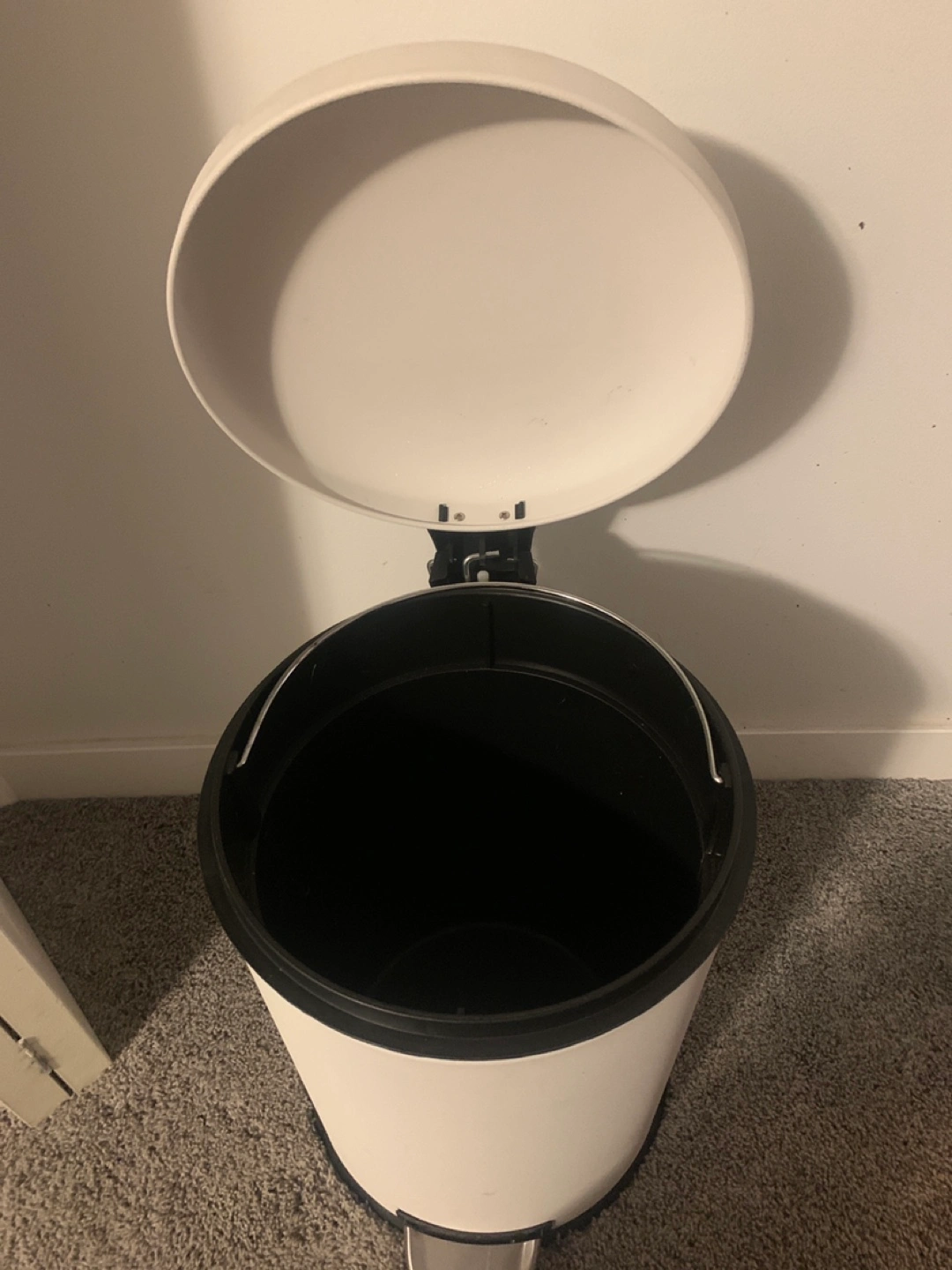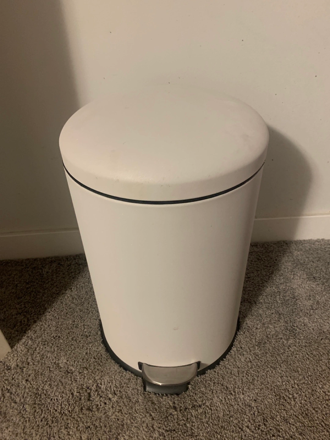 A white pedal bin with a stainless steel pedal. It has a capacity of 30 litres and a removable inner bucket. There's a small chip on the rim, but it's otherwise in good condition.