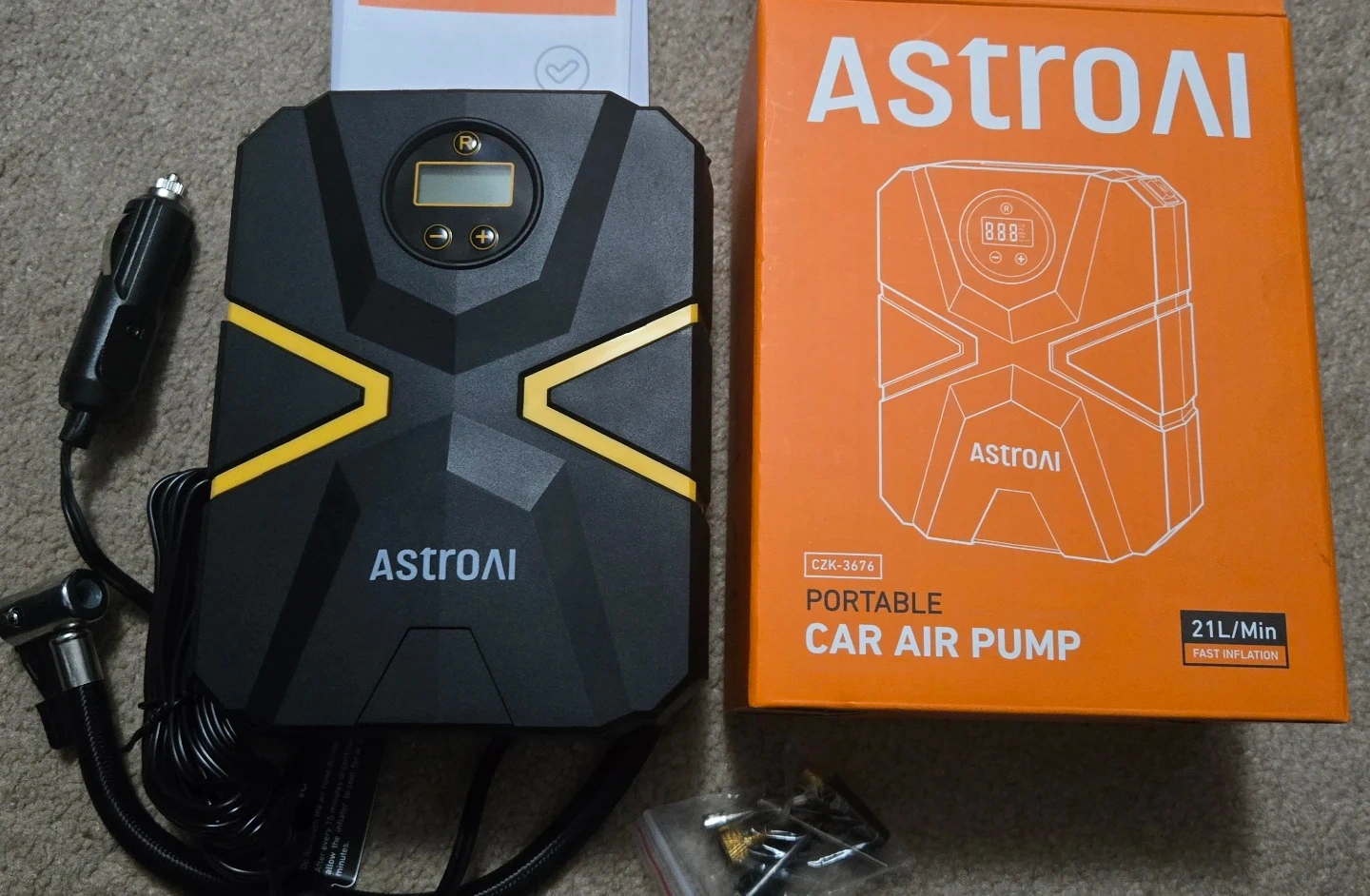 This is an Astrol portable car air pump. It has a digital display for accurate pressure readings and includes various nozzle attachments. The pump has a fast inflation rate of 21L/min. It's great for topping up tires quickly on the go!