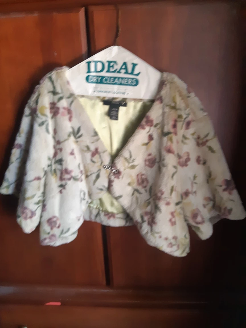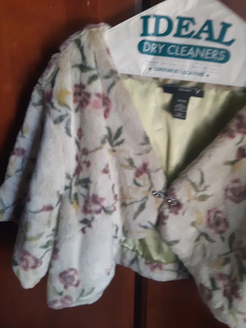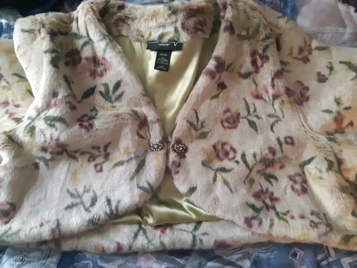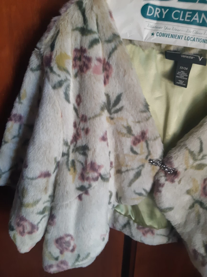 Here's a Jane & Bleecker bolero jacket in size 22/24! It features a pretty floral pattern on a soft, furry material. The jacket is secured with two decorative clasps, adding a touch of elegance. Perfect for layering! This vintage jacket is approximately 65 years old. It is so soft and so beautiful! Looks amazing on.
