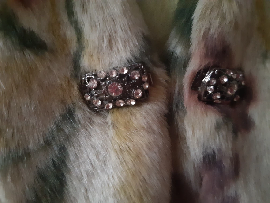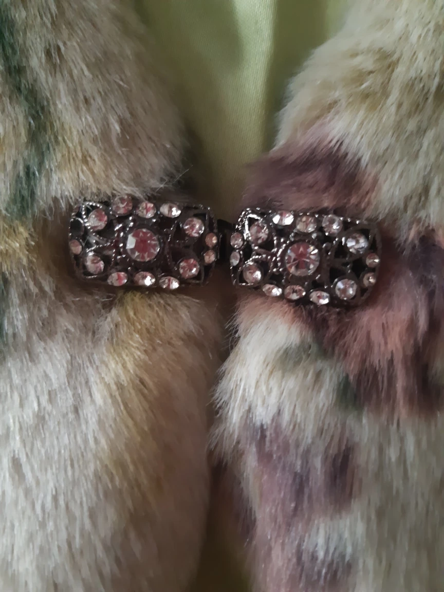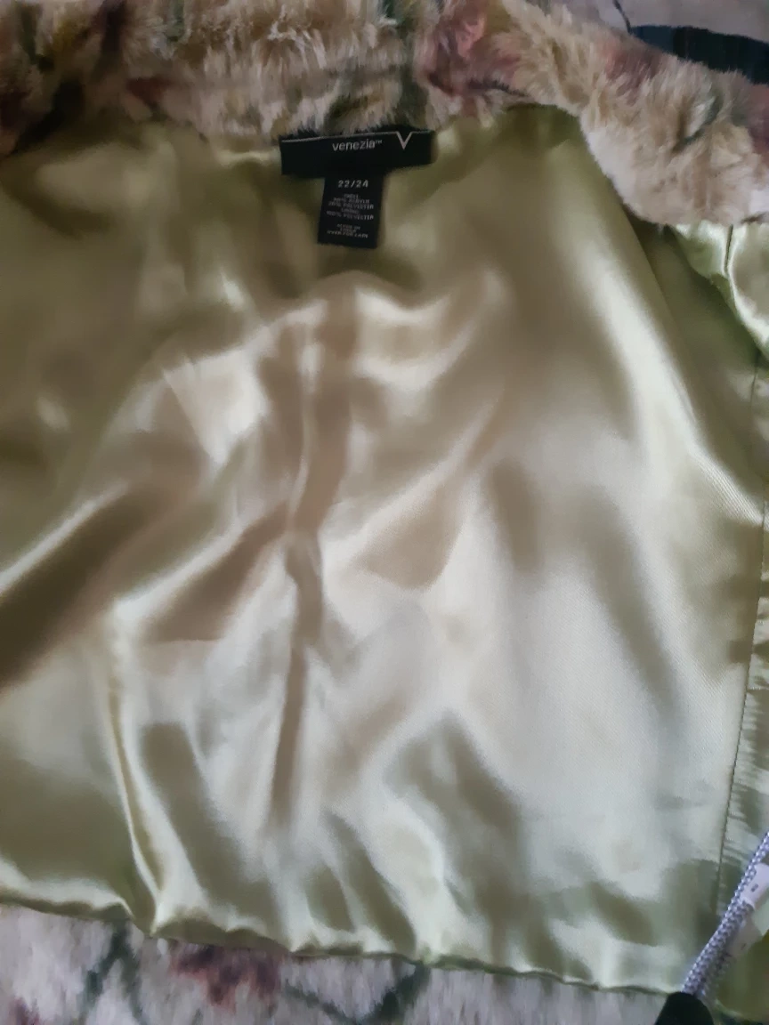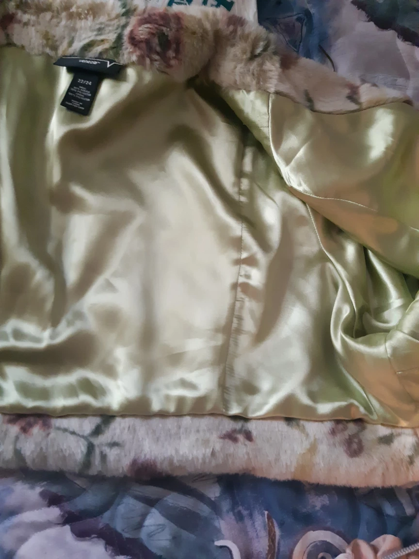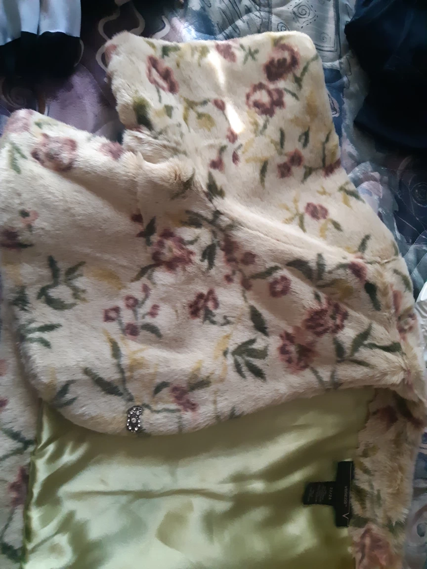 Here's a Jane & Bleecker bolero jacket in size 22/24! It features a pretty floral pattern on a soft, furry material. The jacket is secured with two decorative clasps, adding a touch of elegance. Perfect for layering! This vintage jacket is approximately 65 years old. It is so soft and so beautiful! Looks amazing on.