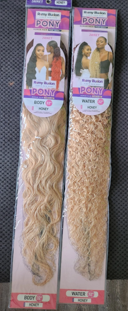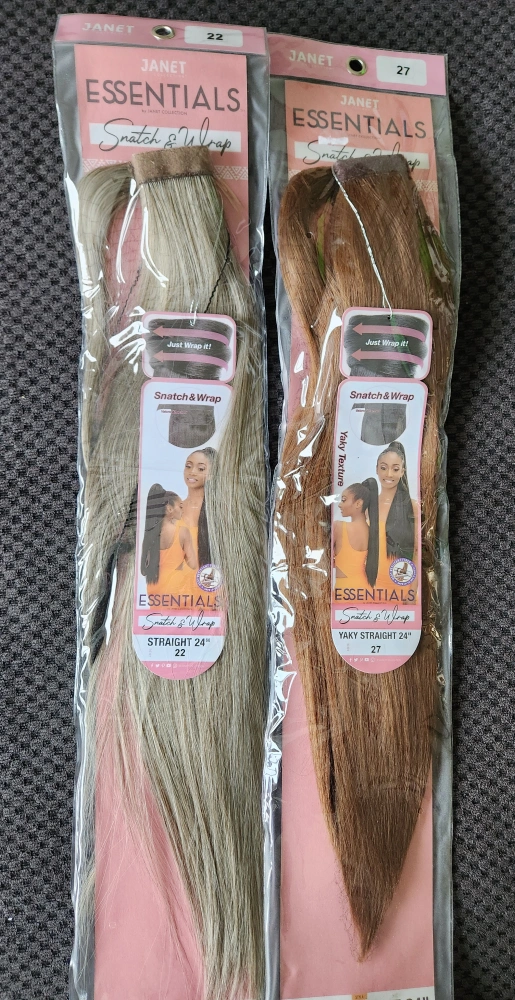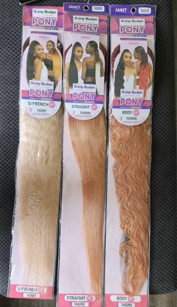 I have a selection of Janet Collection hair extensions available. There are several styles to choose from including Janet Essentials Snatch & Wrap Straight 24" in colour 22 and 27, Remy Illusion Pony Body 32" in Honey, Remy Illusion Pony Water 32" in Honey, Janet Pony S/French 32" in Honey, Janet Pony Straight 32" in Tangerine, and Janet Pony Body 32" in Tangerine. Pick your favourite style! $15.00 each or you can make me an offer