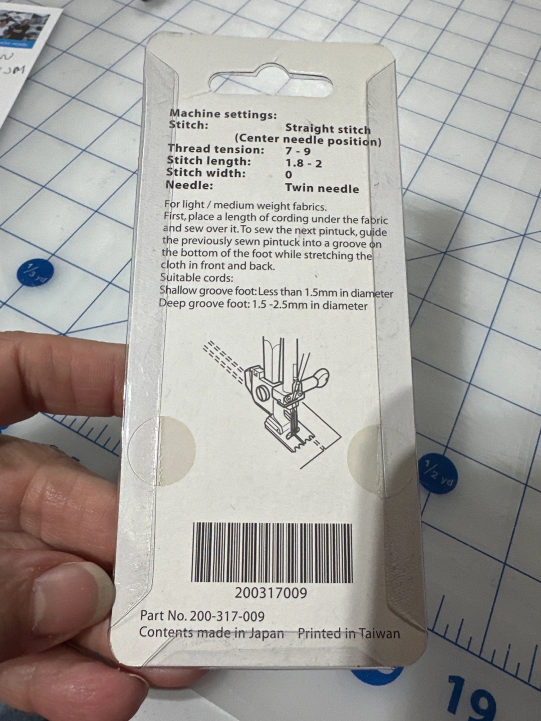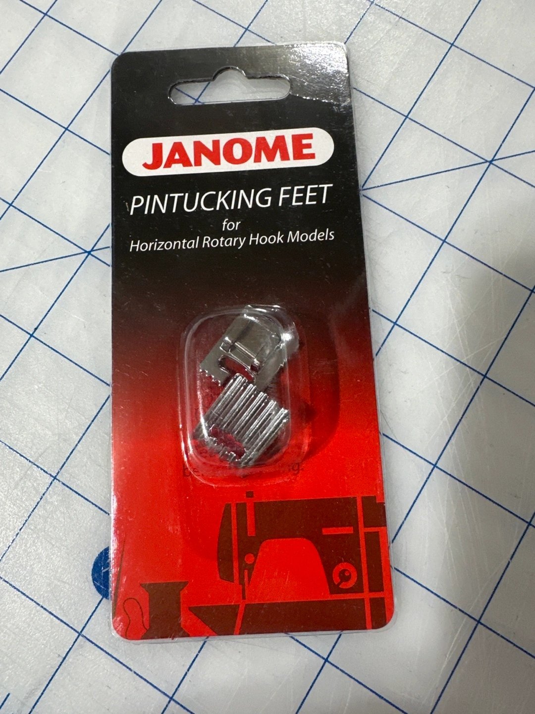 Selling a set of Janome pintucking feet for horizontal rotary hook models. These feet are designed for light to medium weight fabrics and create precise pintucks. The package includes machine settings for straight stitch, thread tension, stitch length, stitch width, and needle type. Part No. 200-317-009