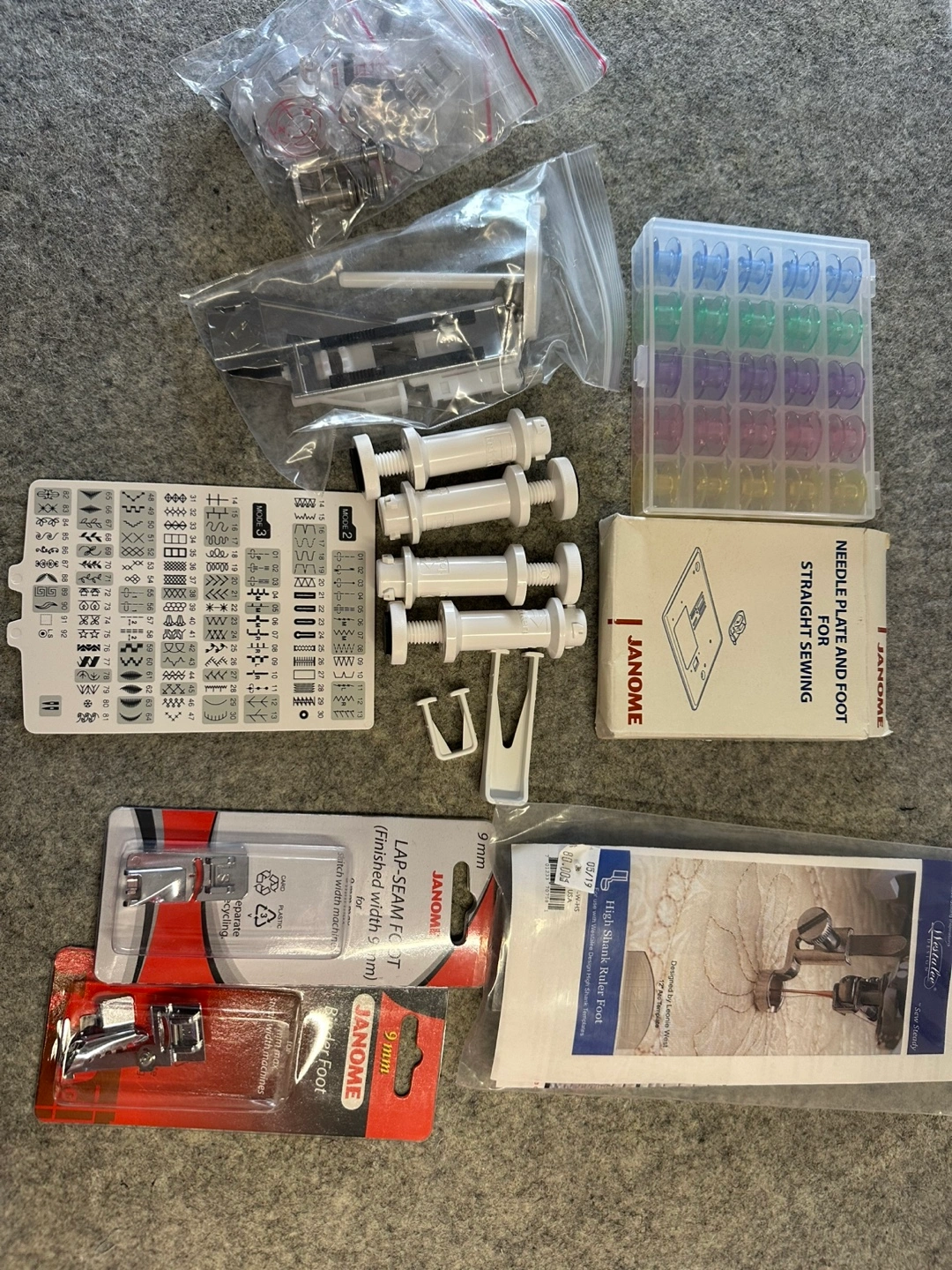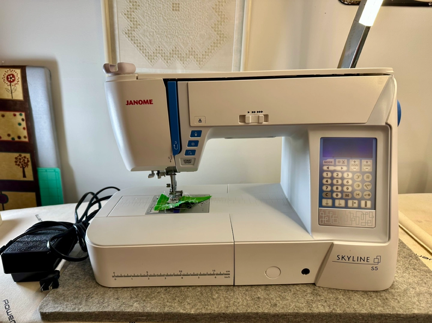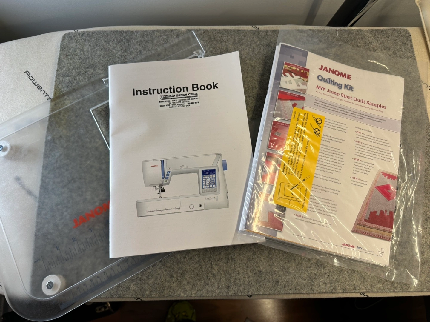 Janome Skyline S5 sewing machine. Includes instruction manual, quilting kit, accessories, carrying case, and Sew Steady quilting ruler. Excellent condition.