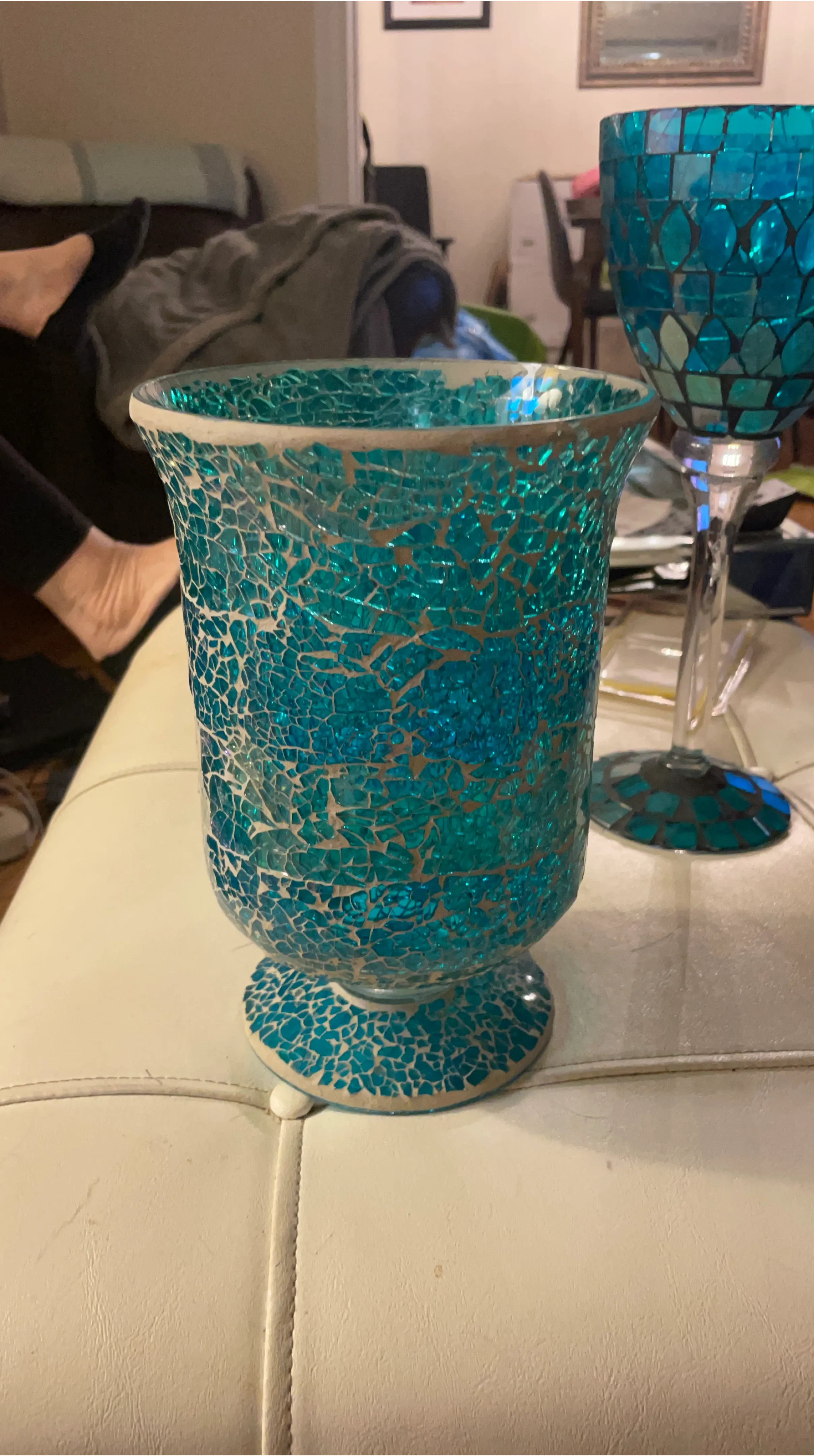 This teal mosaic glass vase features a decorative cracked glass design. Its sturdy base and fluted opening make it suitable for holding flowers or as a standalone decorative piece. A lovely accent for any room!