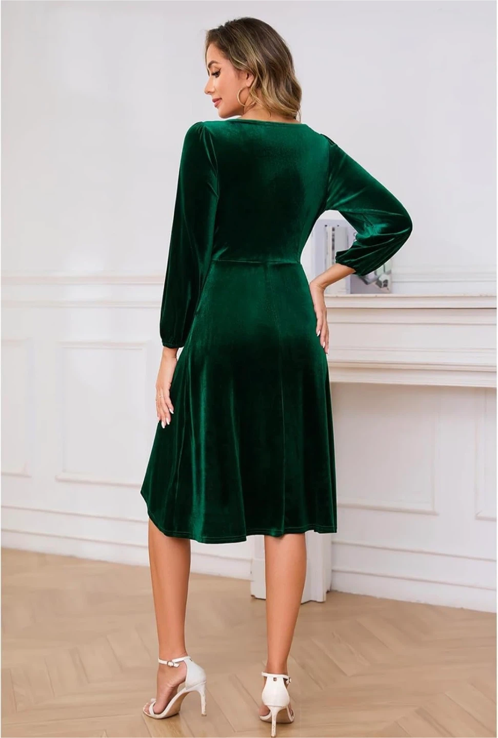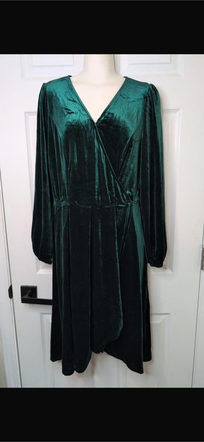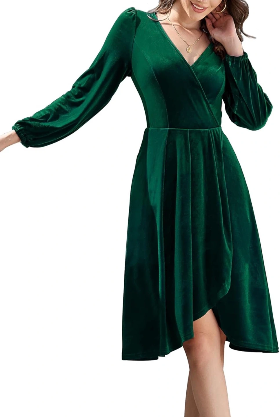 Elegant emerald green velvet wrap dress with long sleeves. It's a flattering A-line silhouette that hits above the knee. This dress is made from soft velvet material. It's suitable for evening events or special occasions!