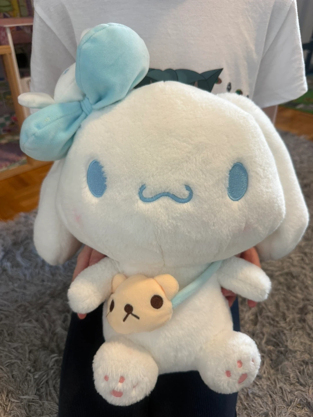 Super soft white Cinnamoroll plush. It's wearing a light blue bow and a cute bear accessory bag. Perfect for plushy lovers