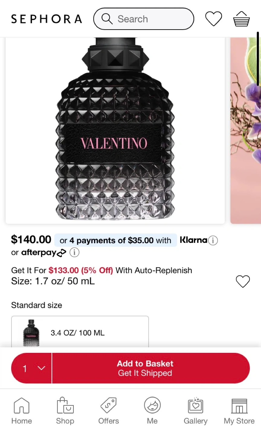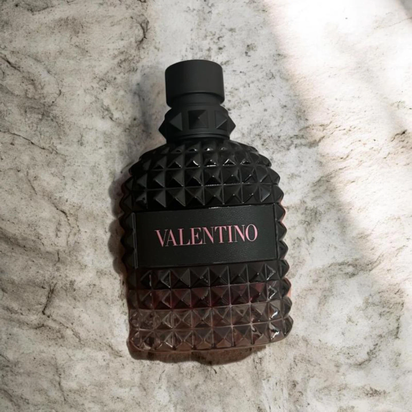 Valentino Eau de Parfum bottle. This fragrance comes in a 50 mL / 1.7 oz size. It's housed in a distinctive studded glass bottle with a black cap. This scent is perfect for everyday wear.