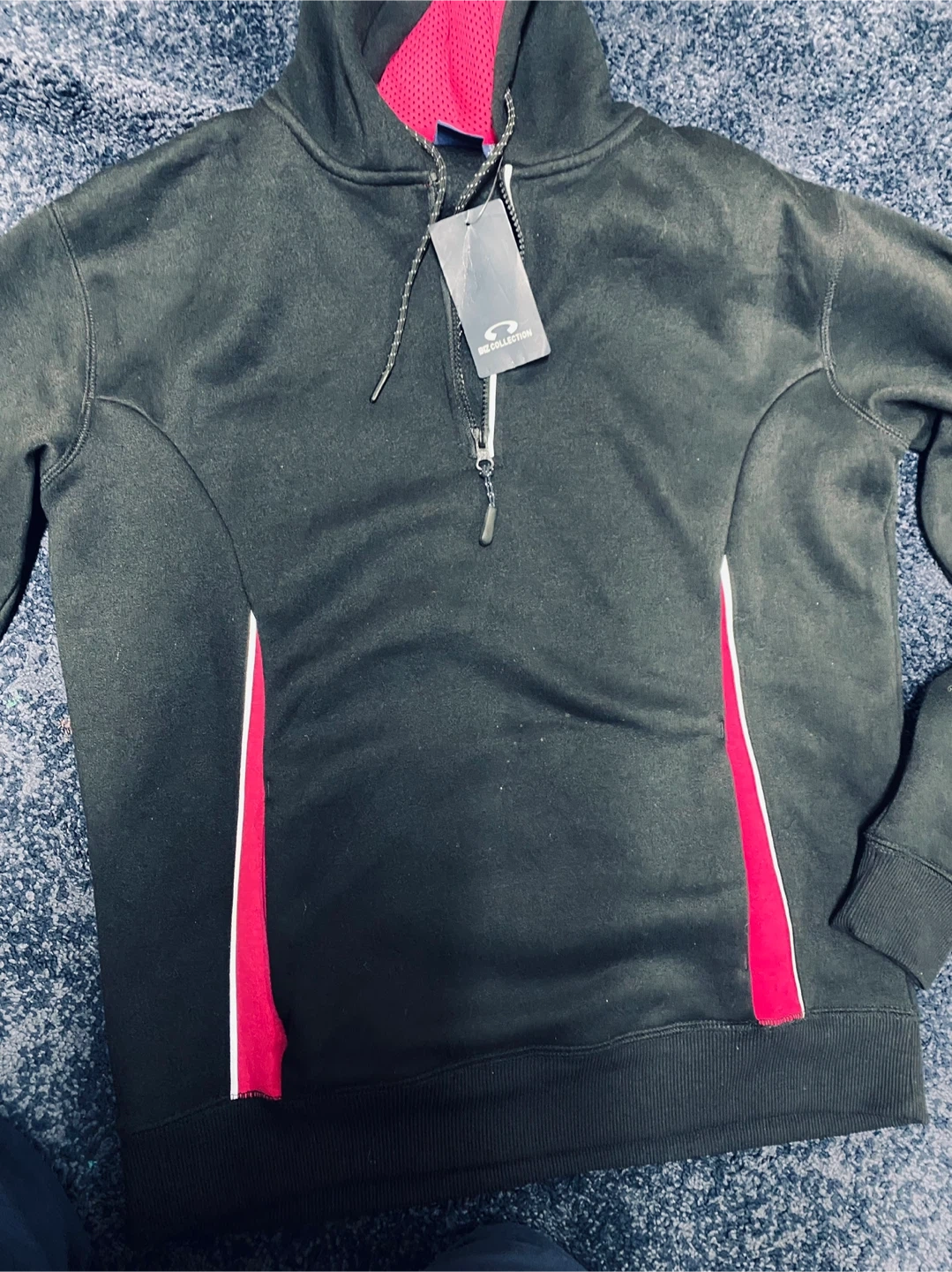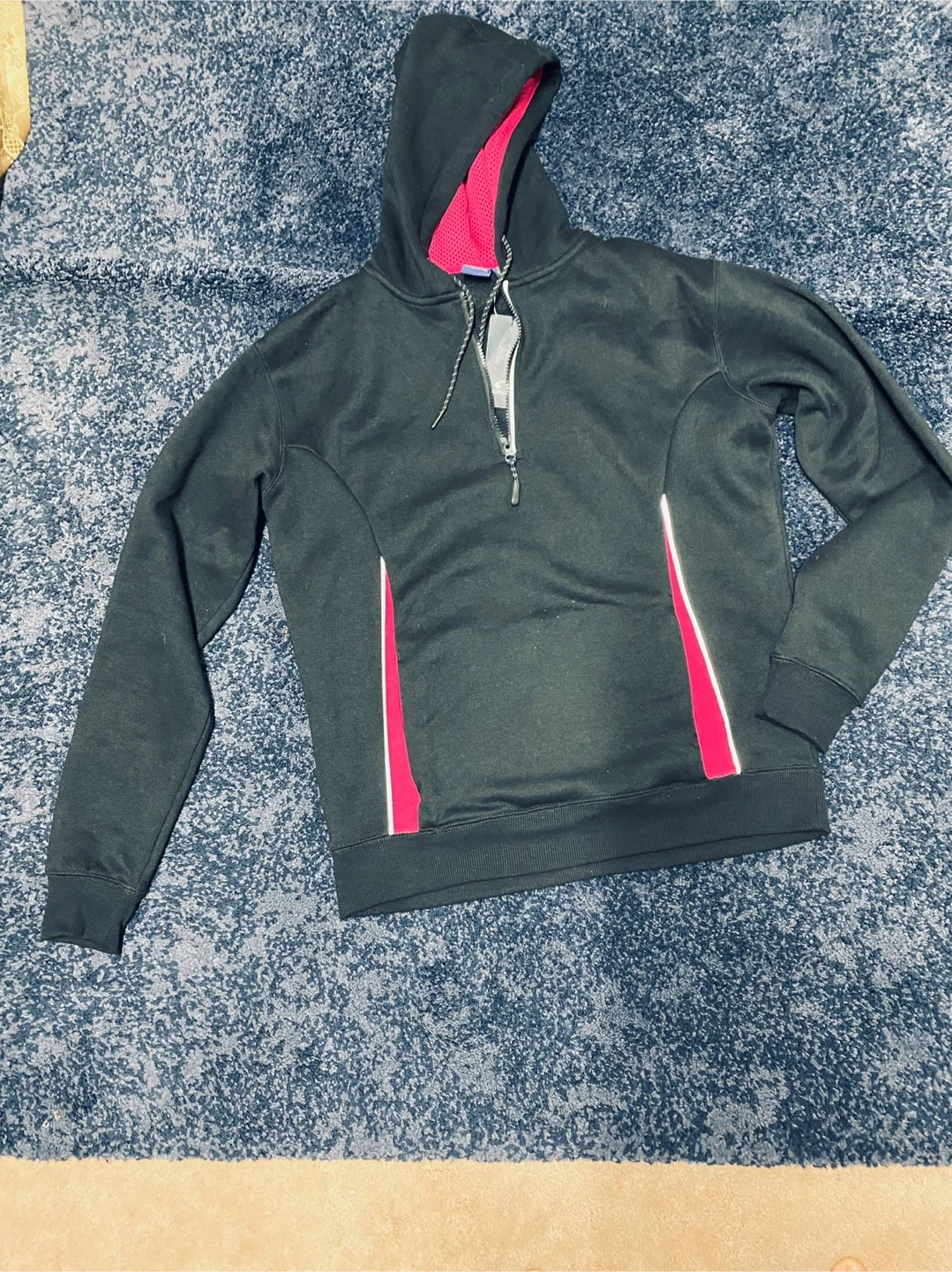 New BIZ COLLECTION hoodie. Black color with cool pink mesh lining in the hood. Has a half-zip front and pink and white stripes on the sides. Size Small - Medium for ladies. Super comfy.