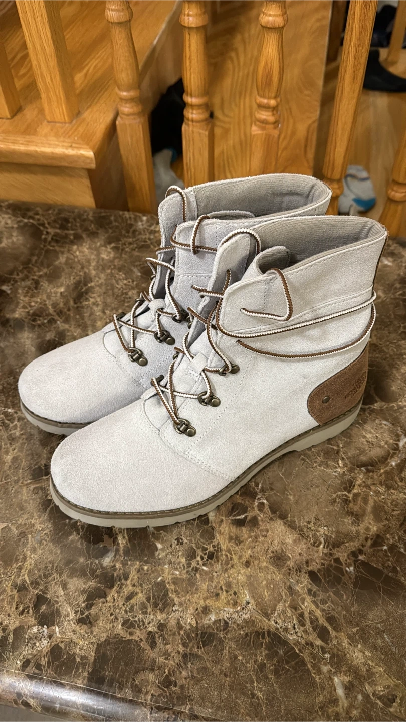Light grey suede winter boots from The North Face. Lace-up style with brown accent details. Perfect for keeping your feet warm and dry during colder months!