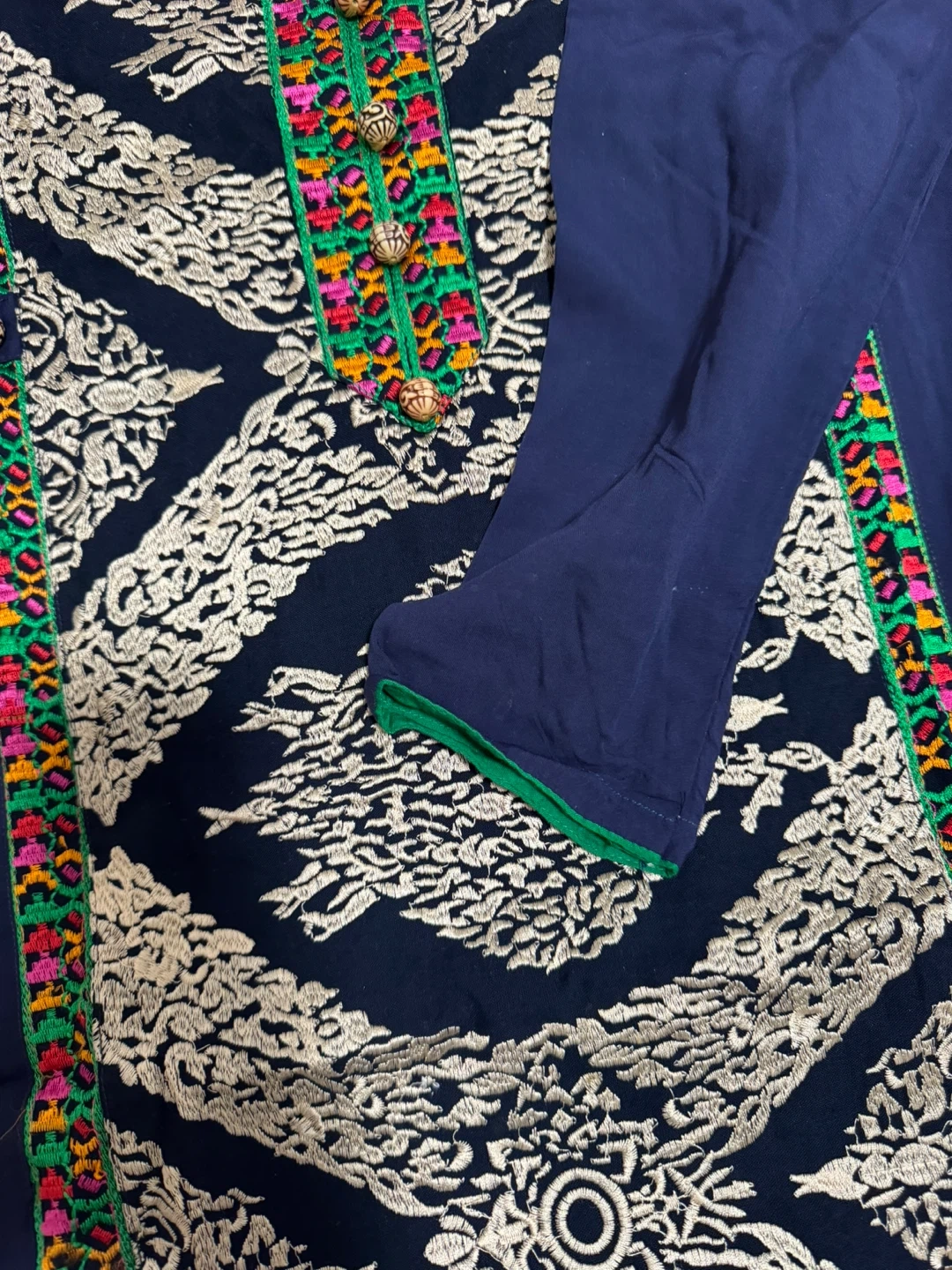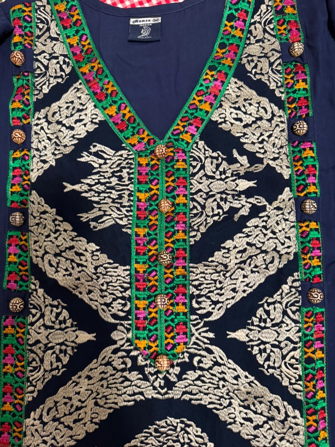Beautiful navy blue kurti with intricate gold, green, pink, and red embroidery. It features a V-neck and decorative buttons. Size medium. It has a very soft dupatta with green pant