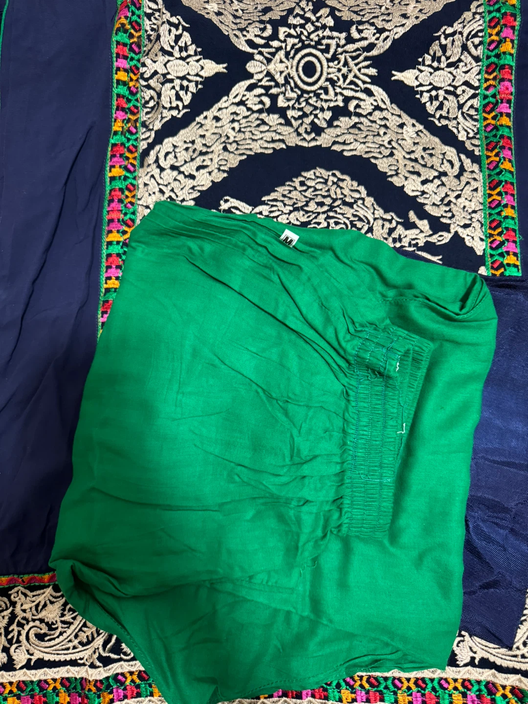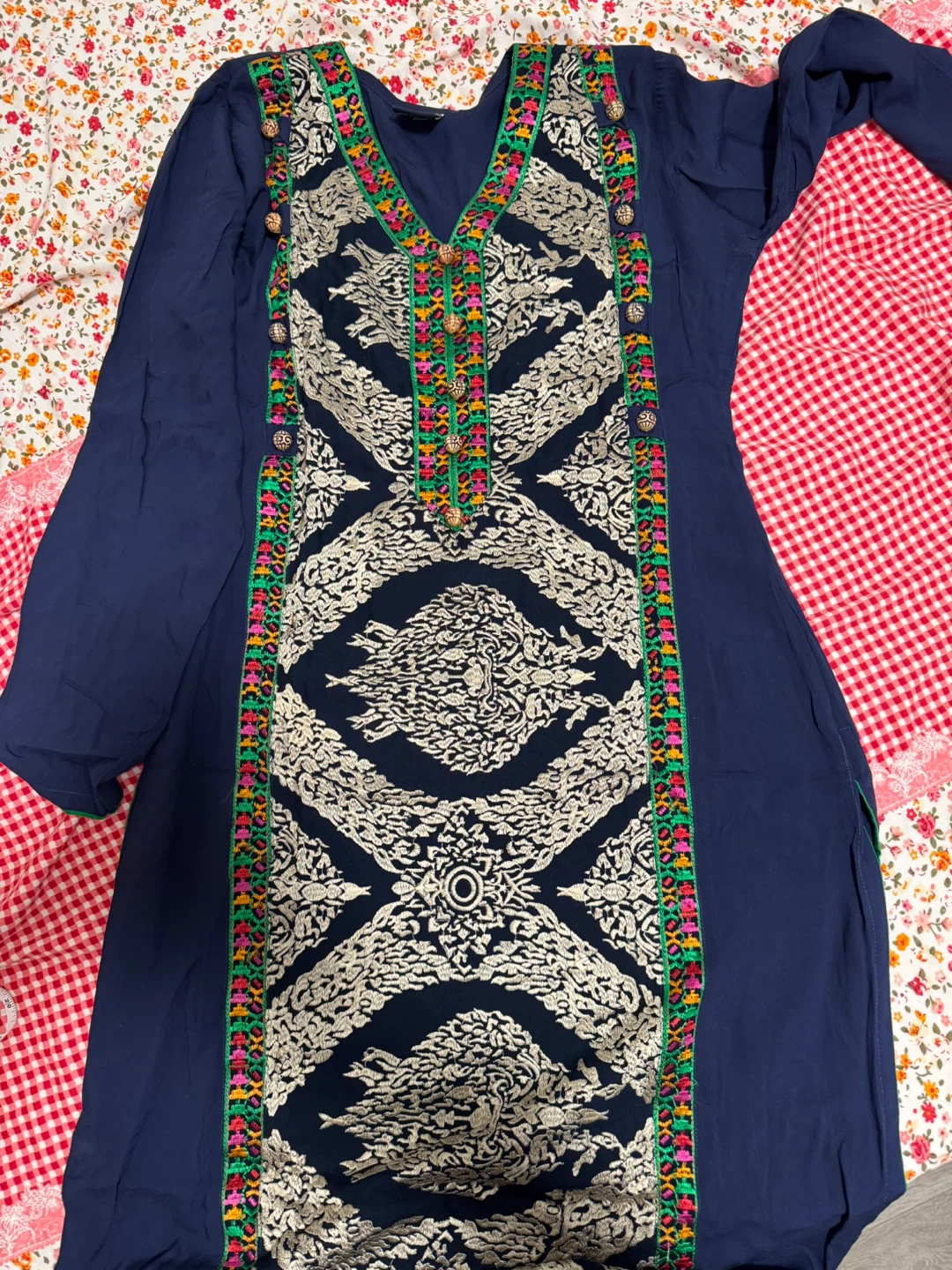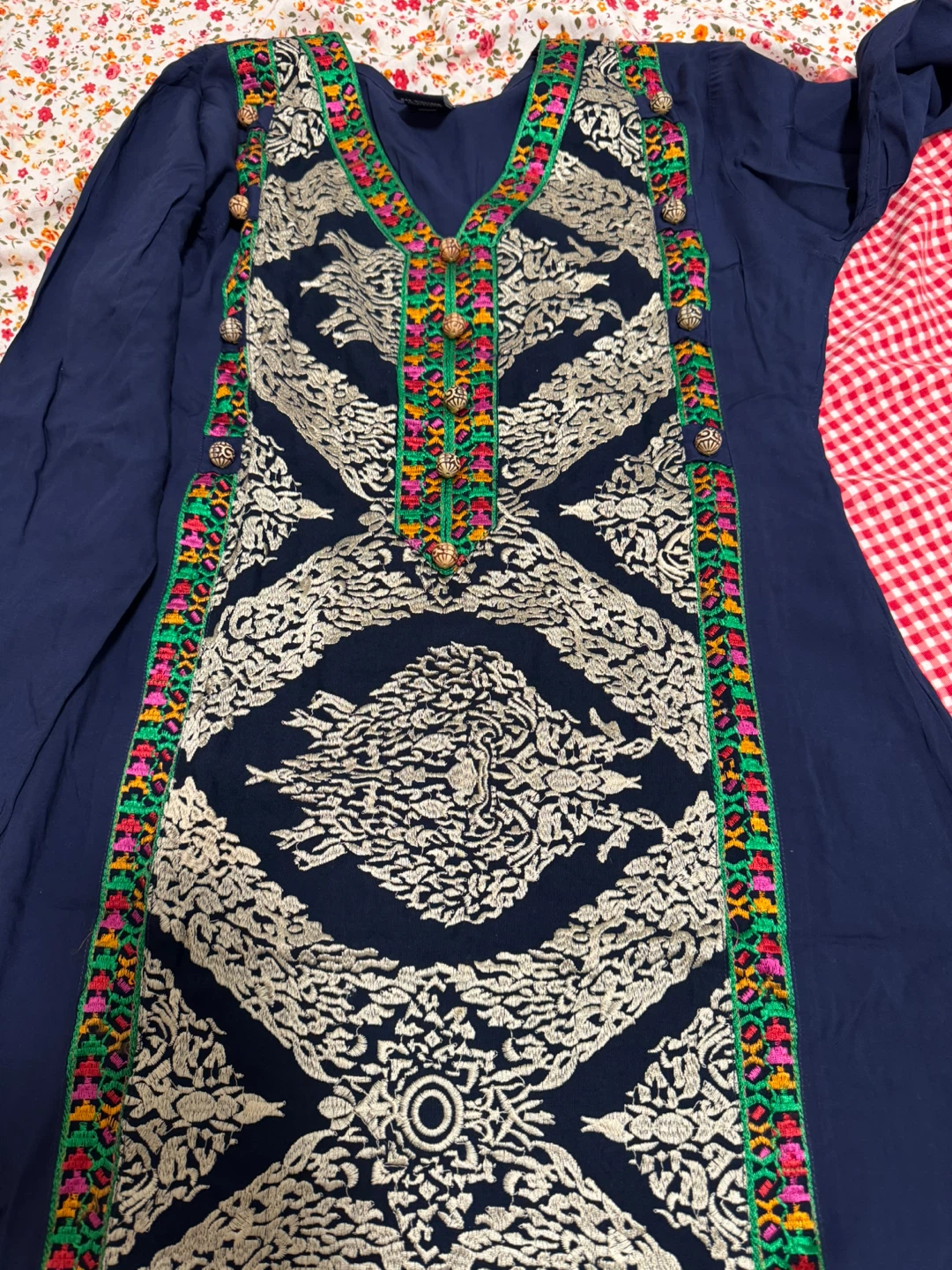 Beautiful navy blue kurti with intricate gold, green, pink, and red embroidery. It features a V-neck and decorative buttons. Size medium. It has a very soft dupatta with green pant