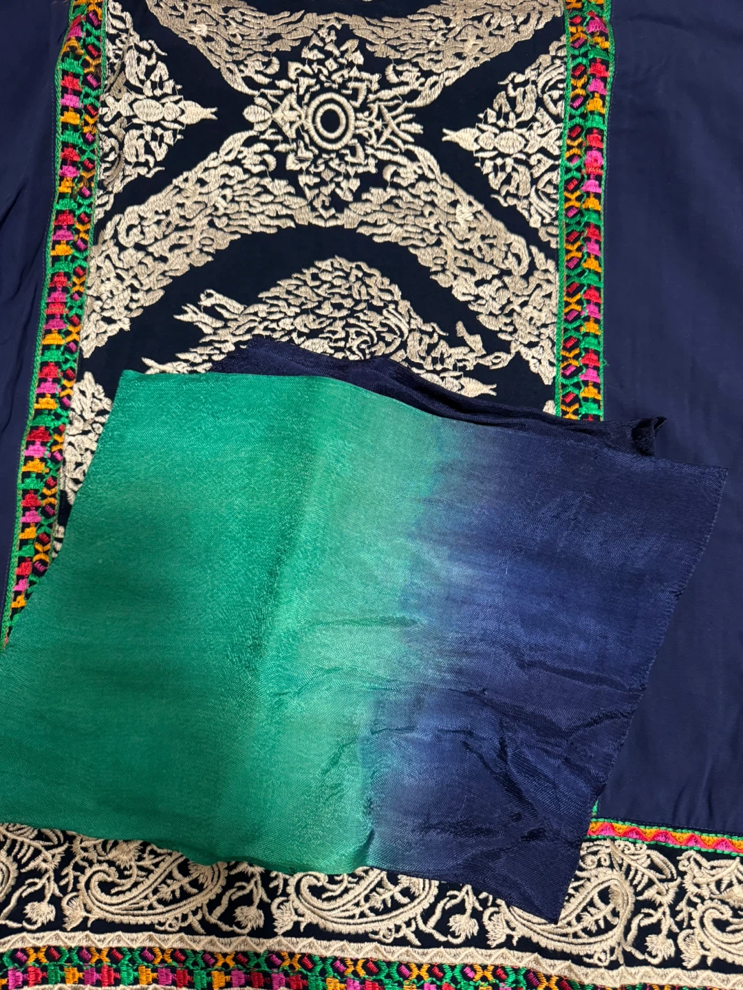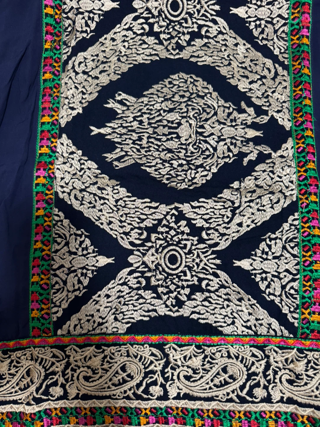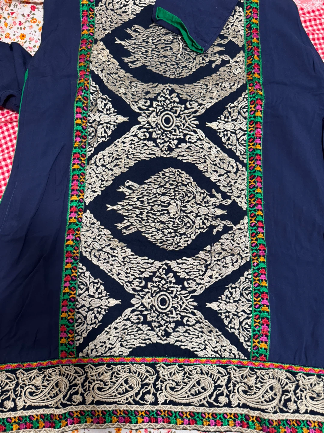 Beautiful navy blue kurti with intricate gold, green, pink, and red embroidery. It features a V-neck and decorative buttons. Size medium. It has a very soft dupatta with green pant