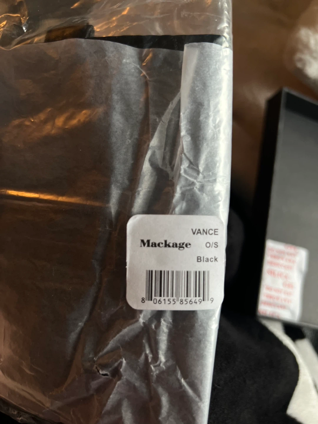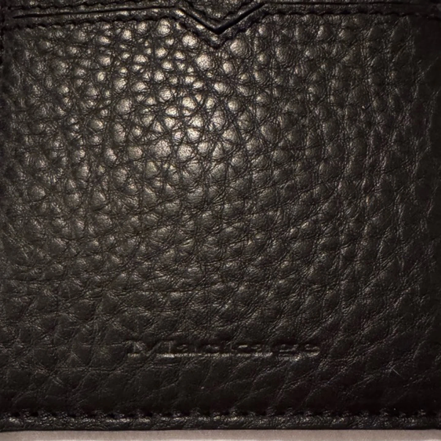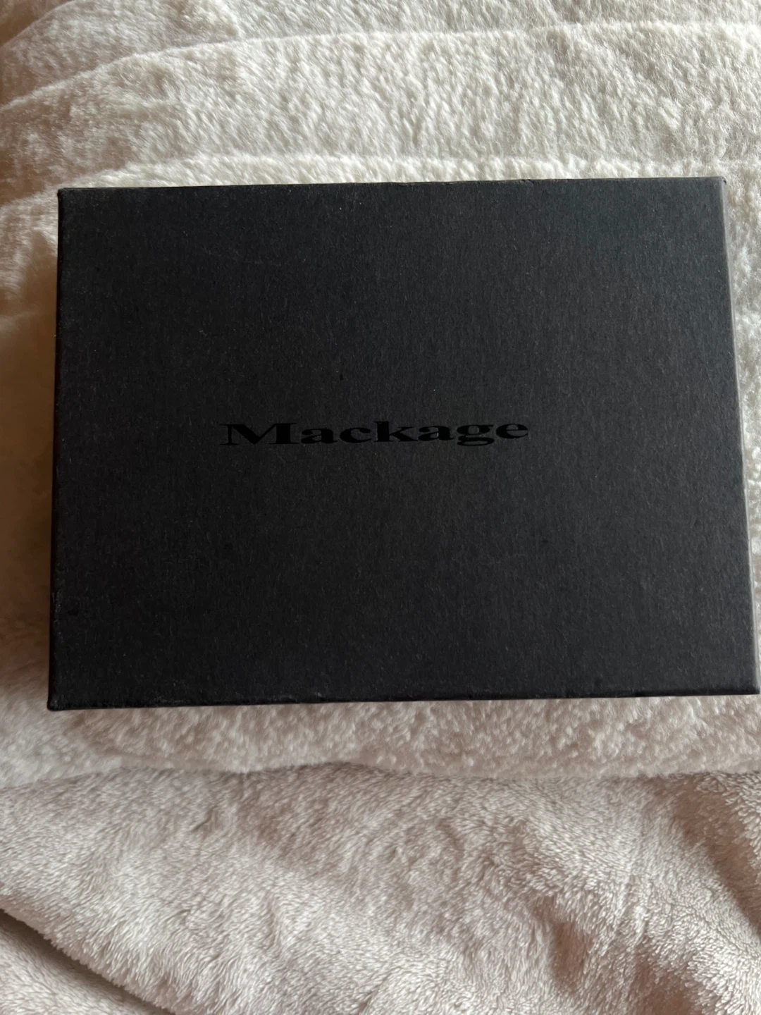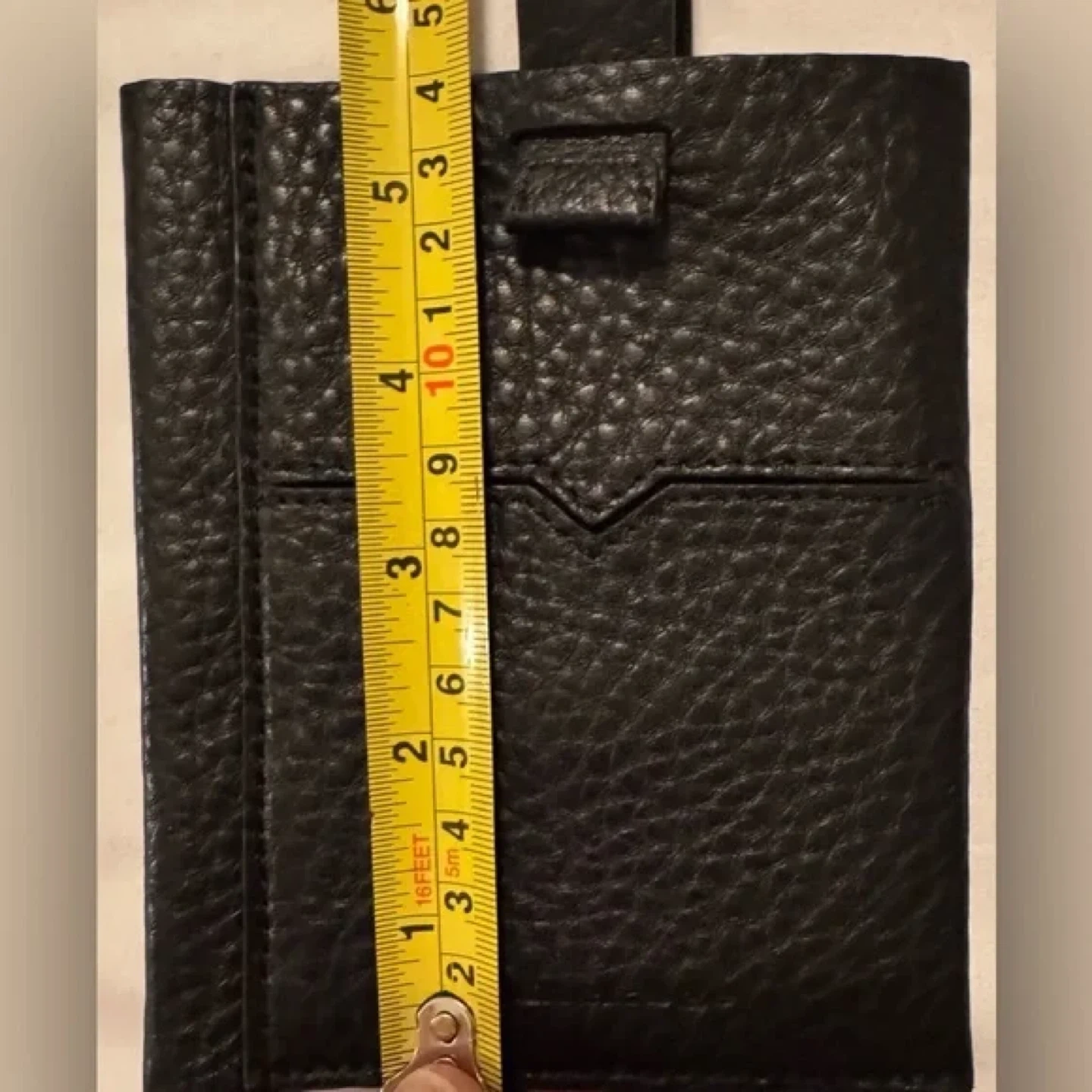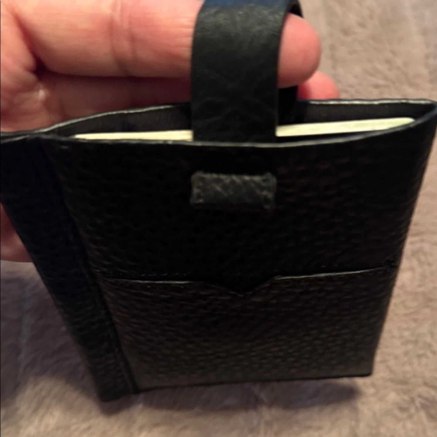This is a stylish black leather card holder from Mackage. It's made with pebbled leather and comes with a matching pen. The holder measures approximately 6 inches tall and 4 inches wide. It's perfect for travel or everyday organization!