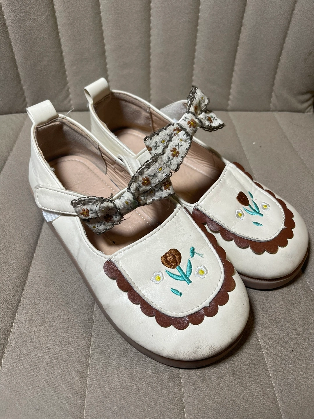 Adorable little girls' shoes. Size 21.5. White leather-like material. Features embroidered flowers and a cute bow. Brown scalloped edging.