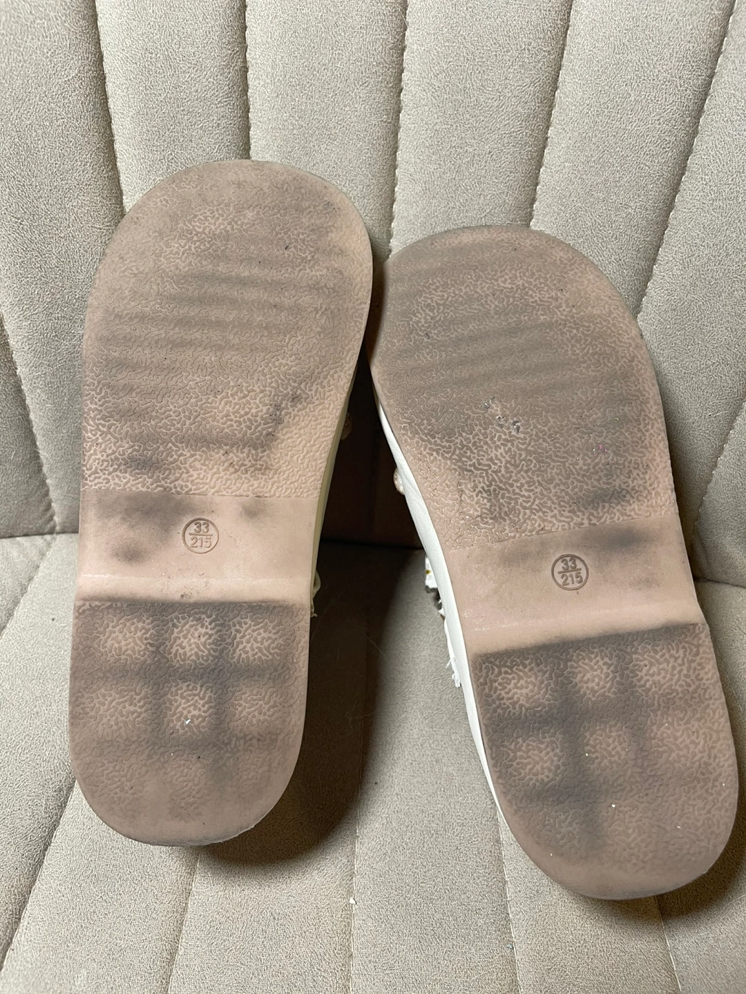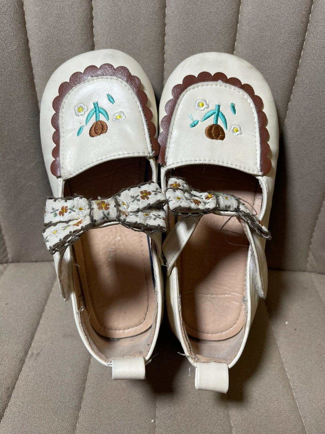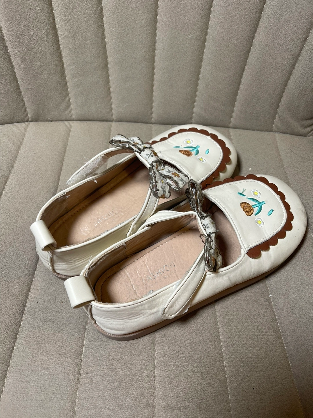 Adorable little girls' shoes. Size 21.5. White leather-like material. Features embroidered flowers and a cute bow. Brown scalloped edging.