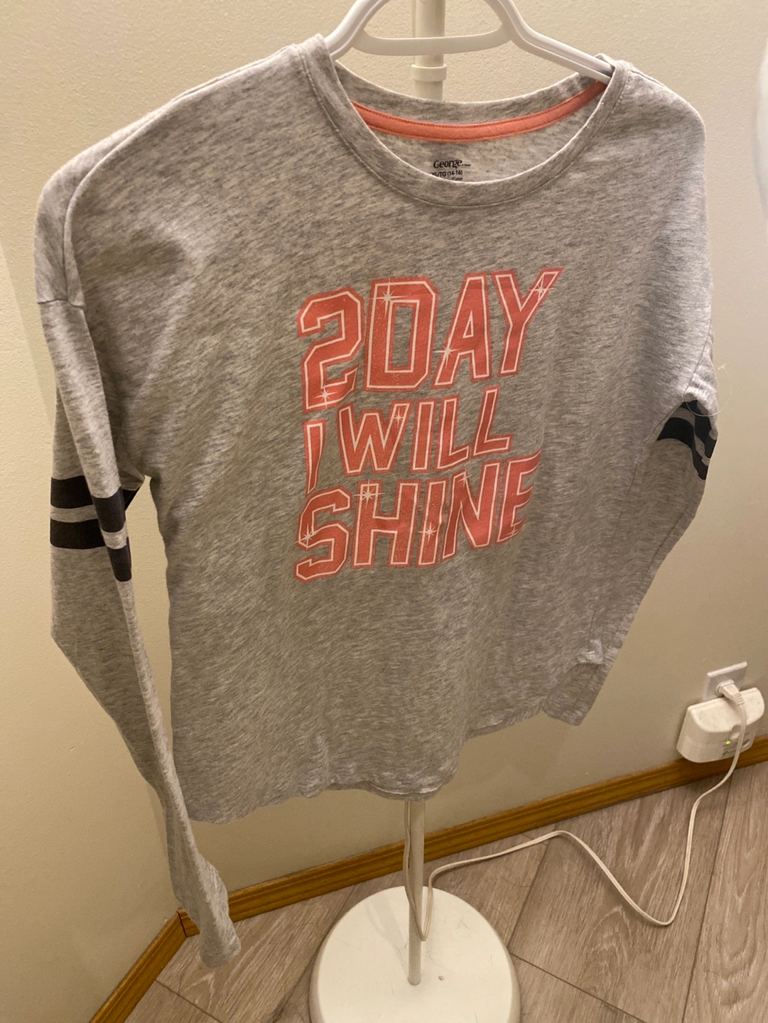 Grey long-sleeve shirt. Features a pink graphic that says "2Day I Will Shine". Size 10-12. Black and white stripes on cuffs. Brand George