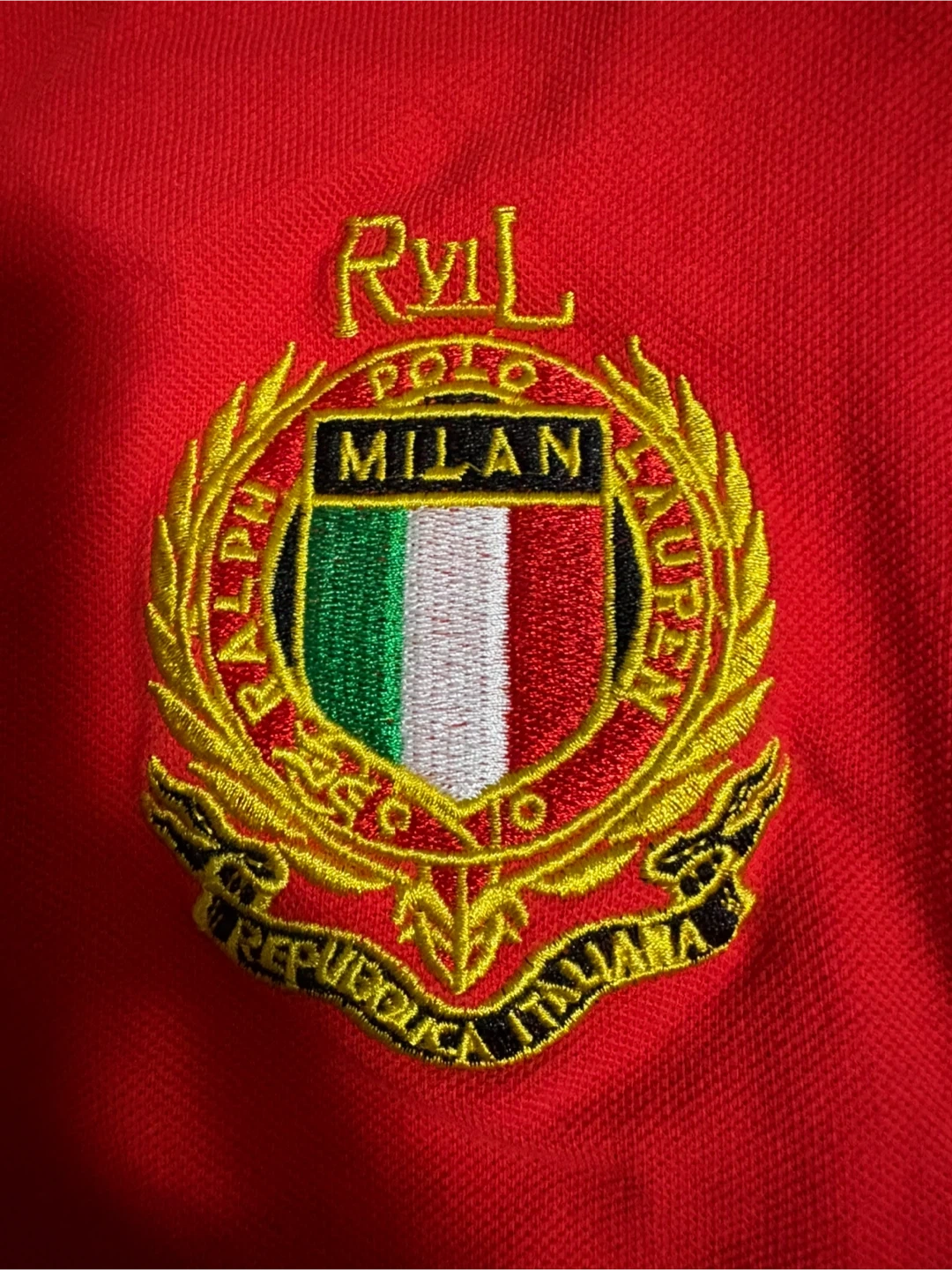 This is a Polo Ralph Lauren slim fit polo shirt in red. It features the iconic Polo player logo and "MILAN" detailing. Size medium.