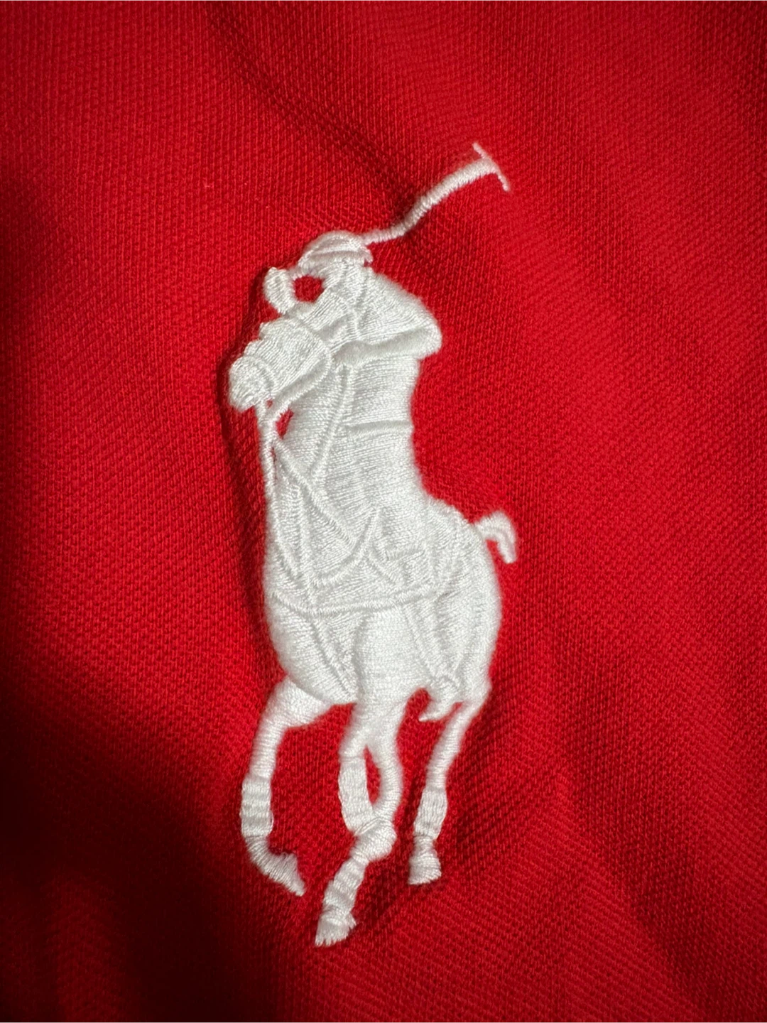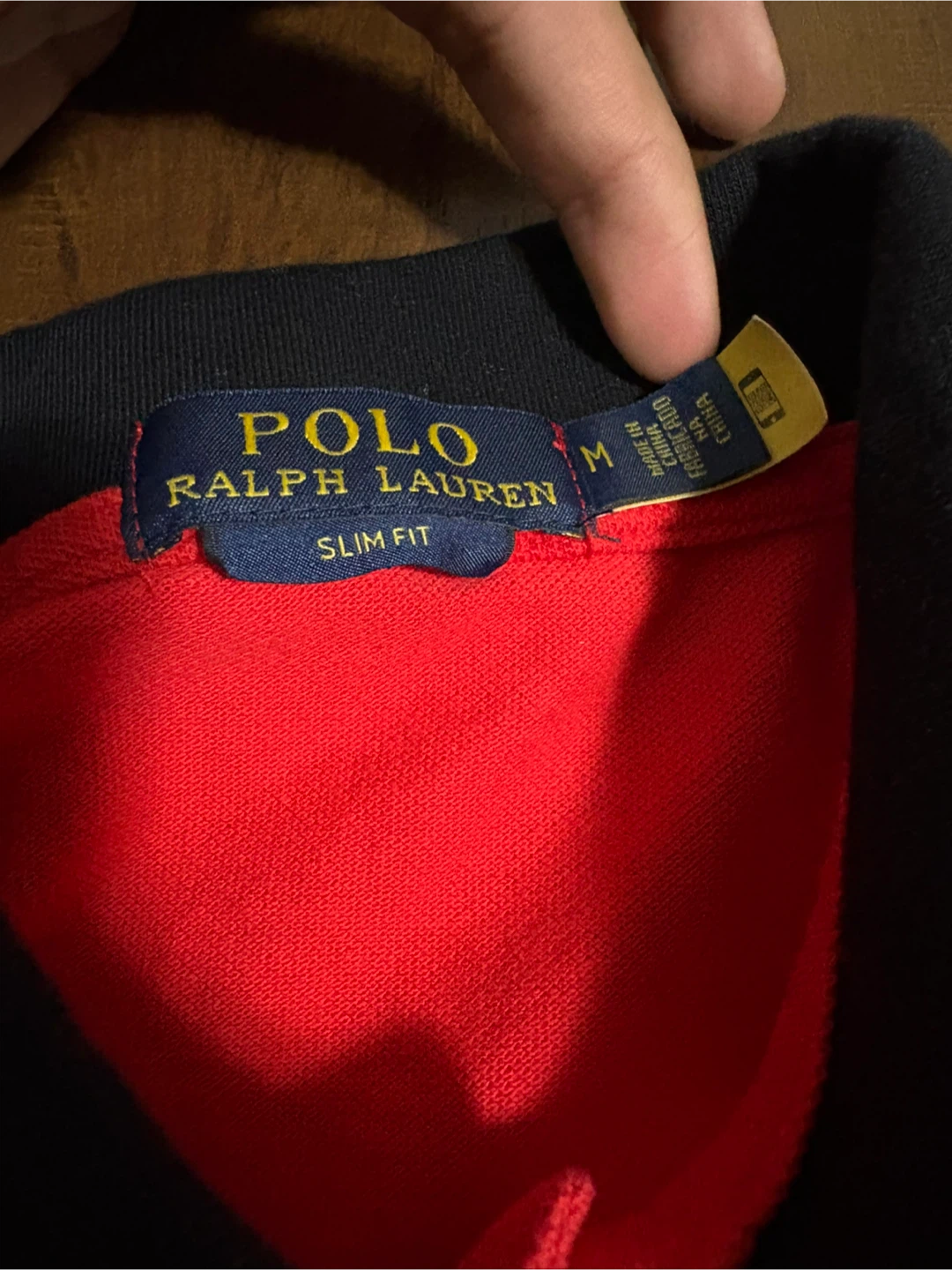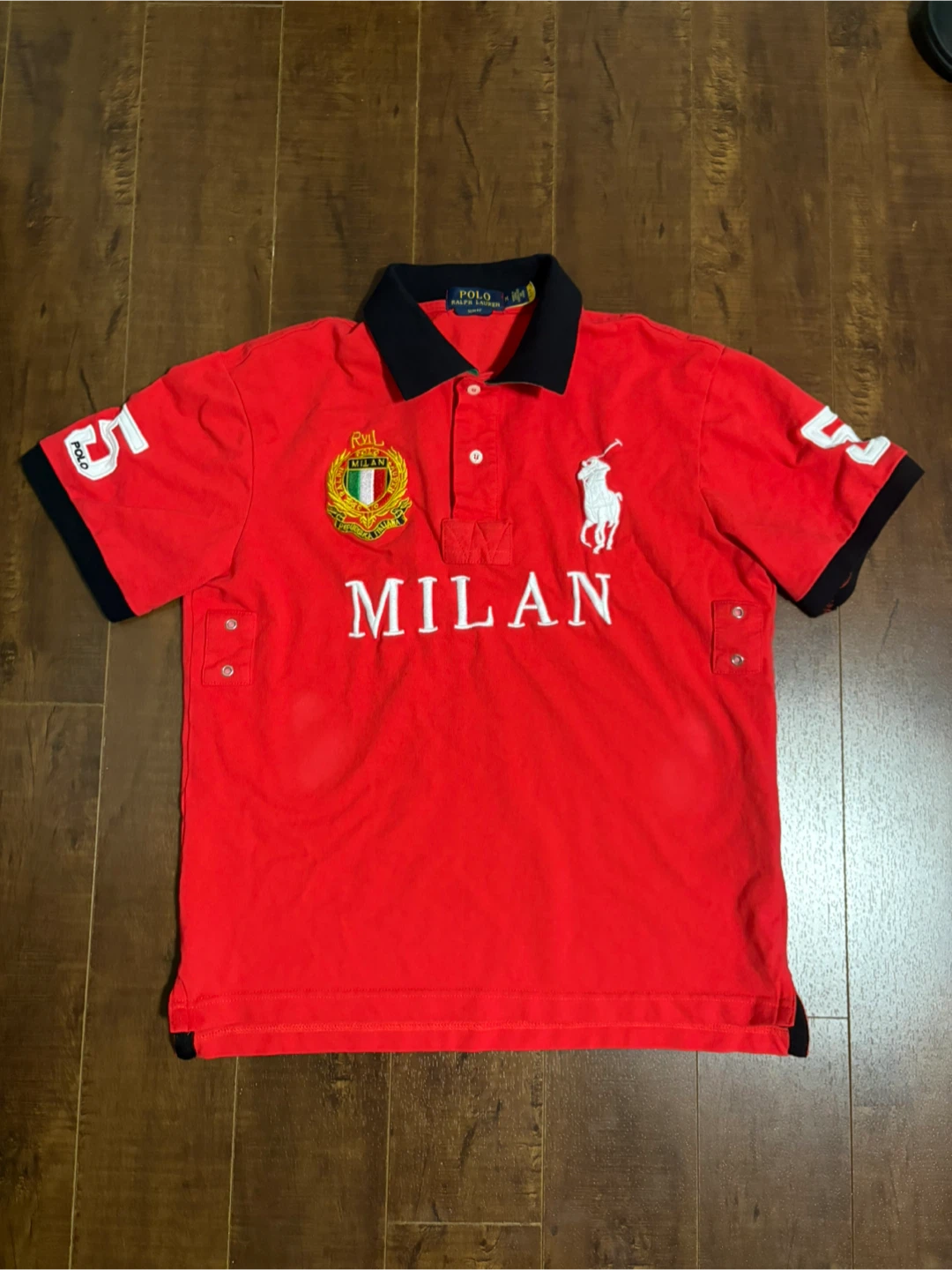 This is a Polo Ralph Lauren slim fit polo shirt in red. It features the iconic Polo player logo and "MILAN" detailing. Size medium.