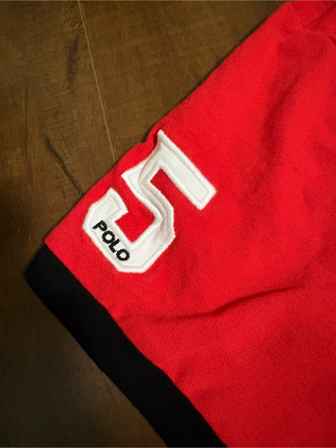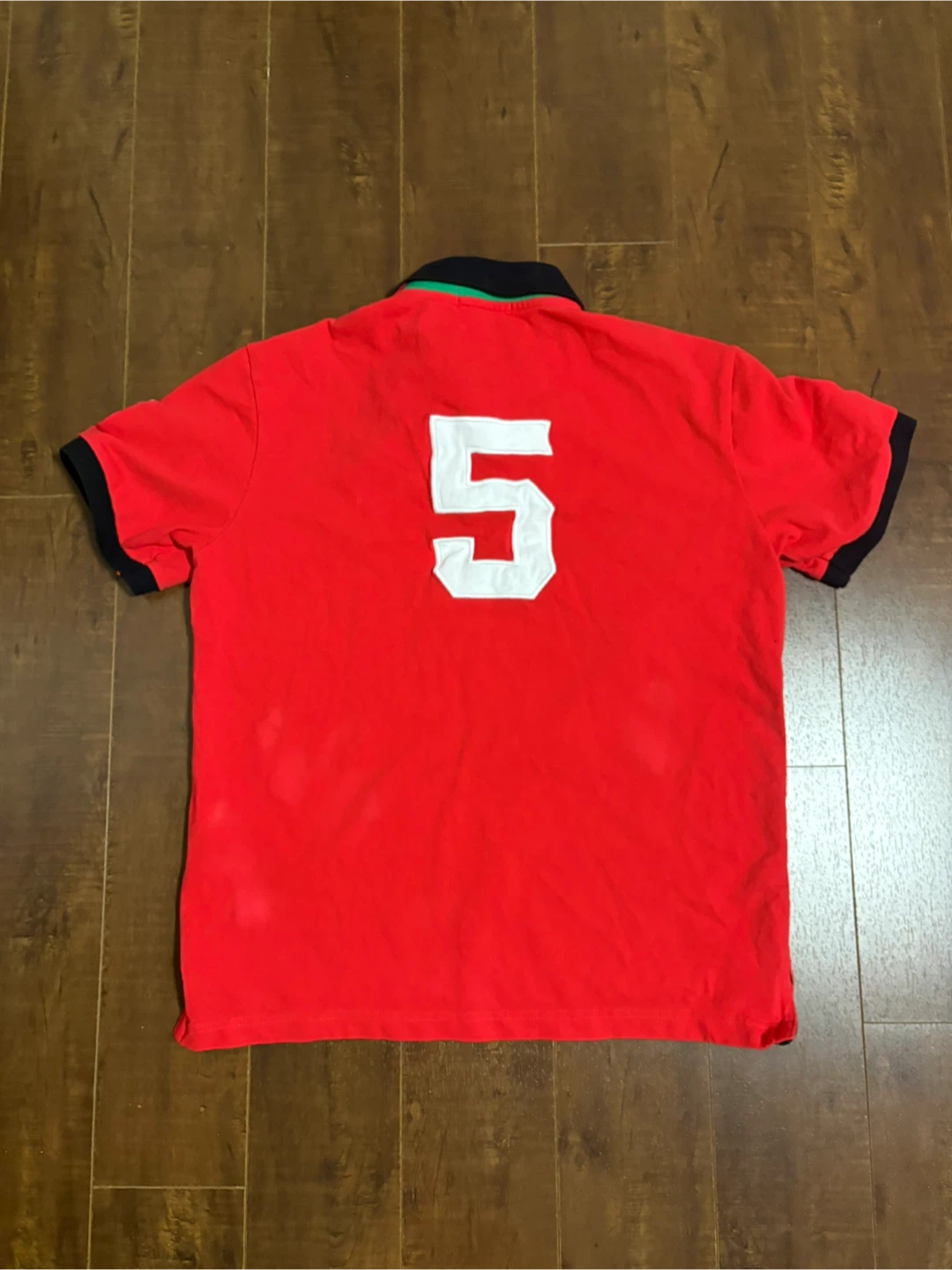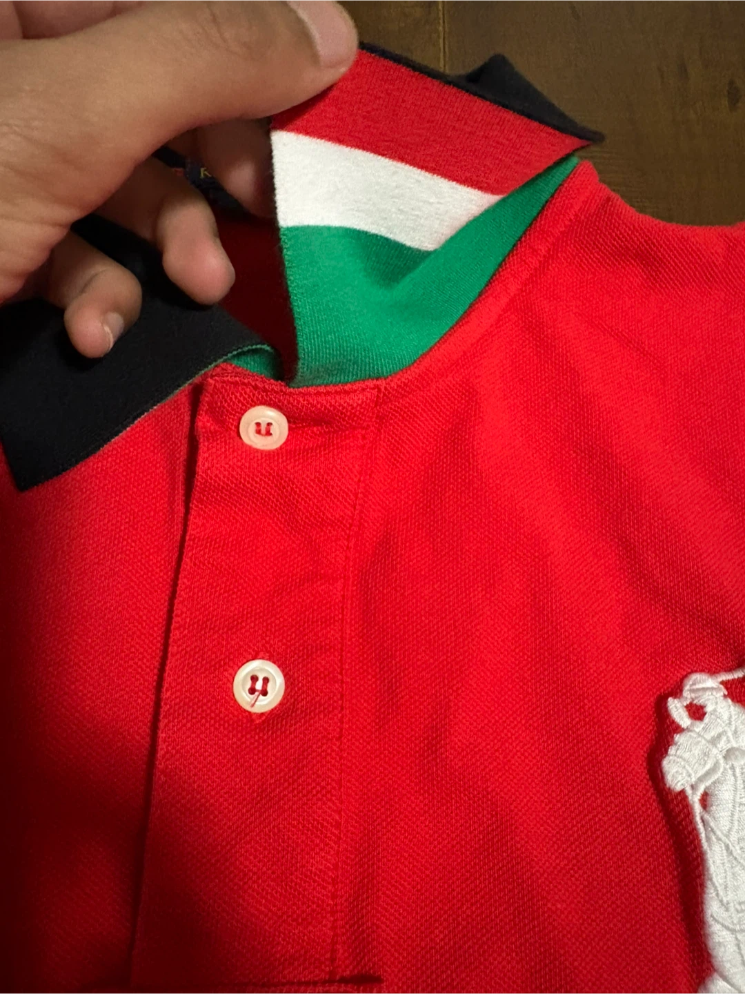 This is a Polo Ralph Lauren slim fit polo shirt in red. It features the iconic Polo player logo and "MILAN" detailing. Size medium.