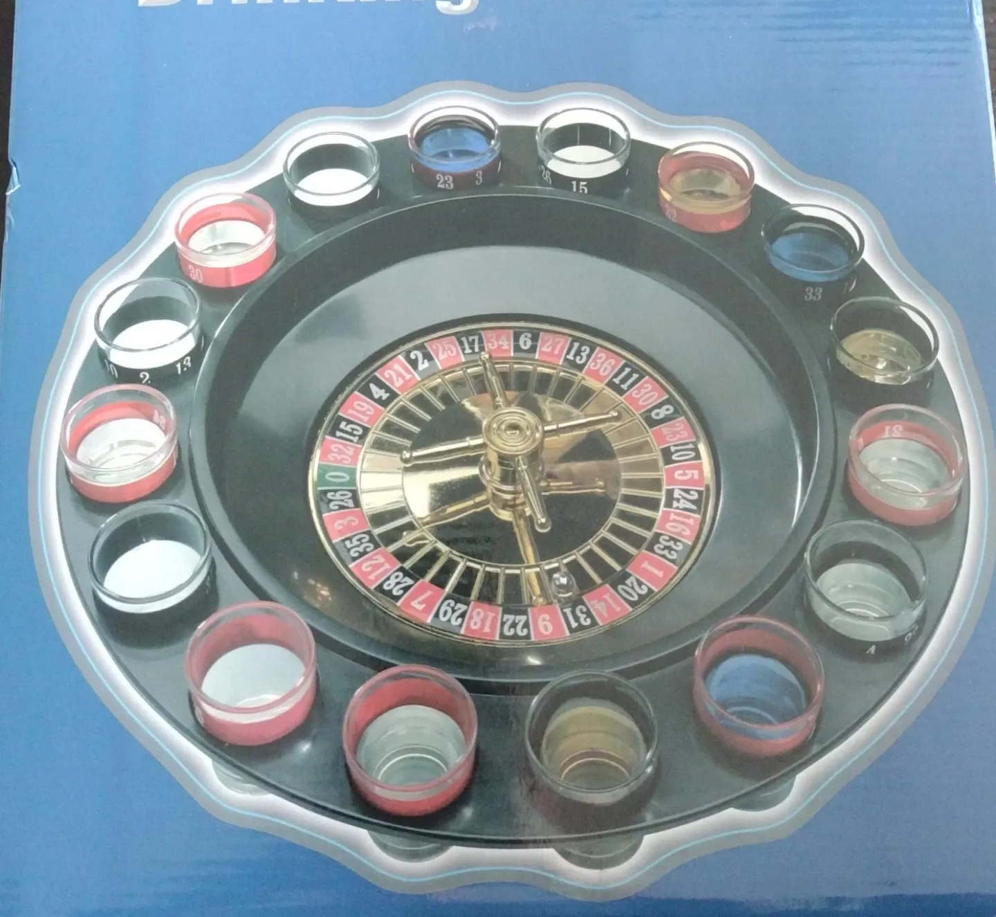 Fun roulette wheel for serving shots. Includes 12 shot glasses with colourful rims. It's perfect for parties and game nights. Bring a casino vibe to your next get-together!