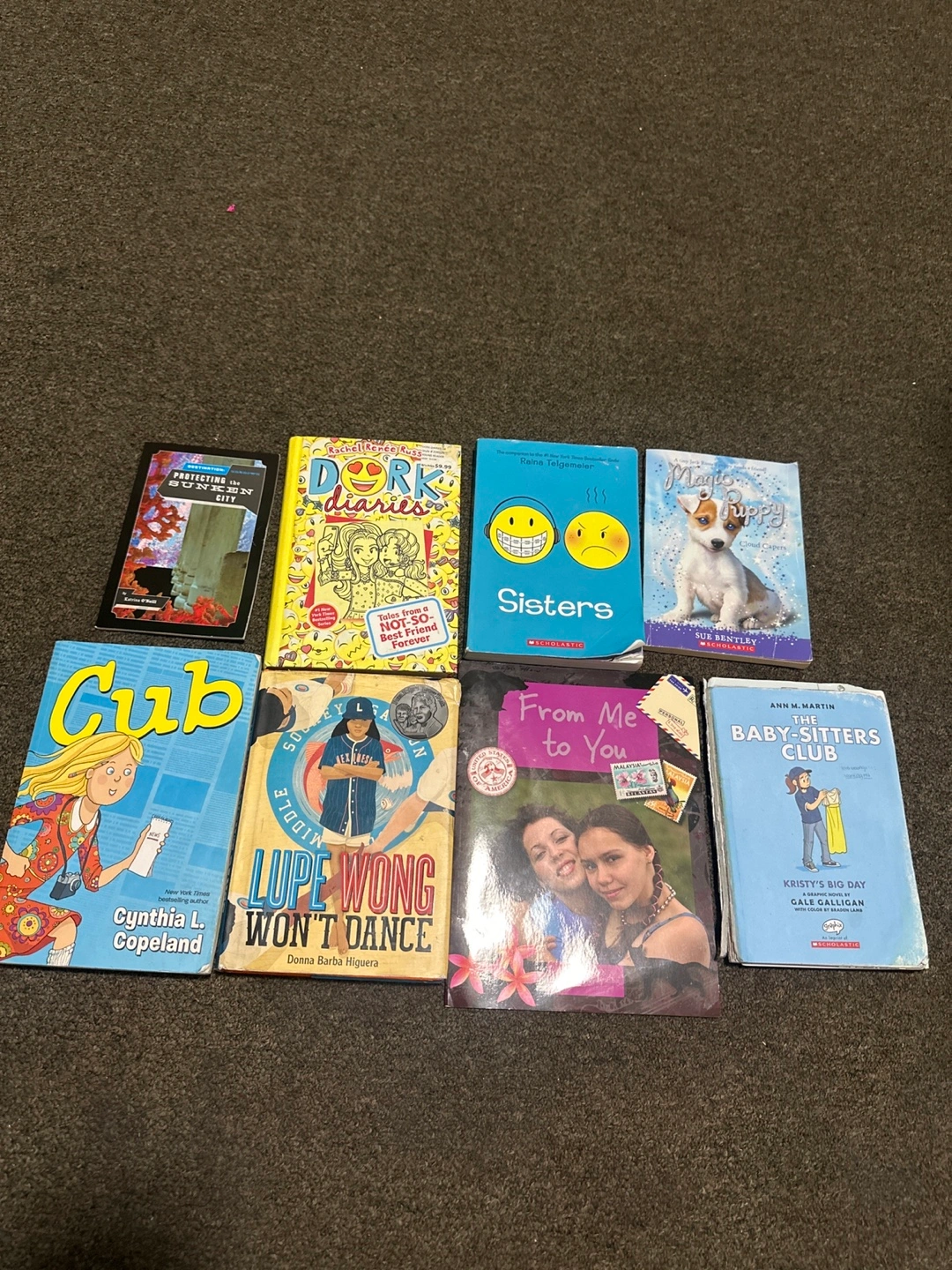 Collection of eight used chapter books. Titles include *Protecting the Sunken City*, *Dork Diaries*, *Sisters*, *Magic Puppy*, *Cub*, *Lupe Wong Won't Dance*, *From Me to You*, and *The Baby-Sitters Club*. Various authors and illustrators.