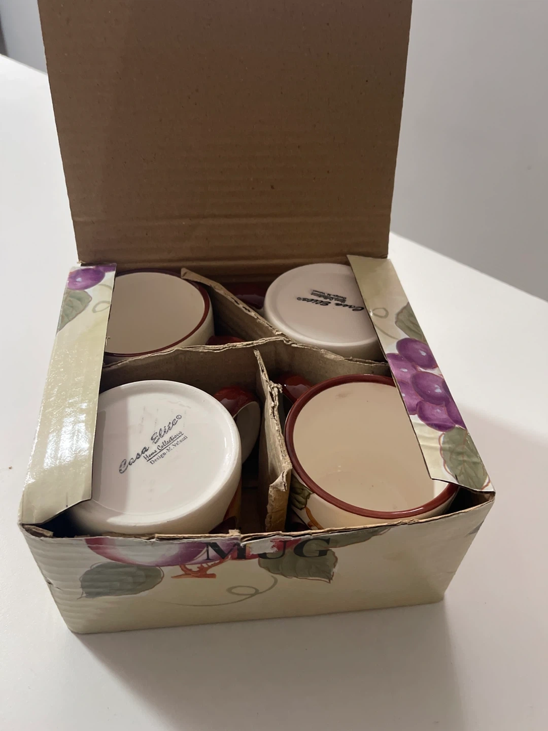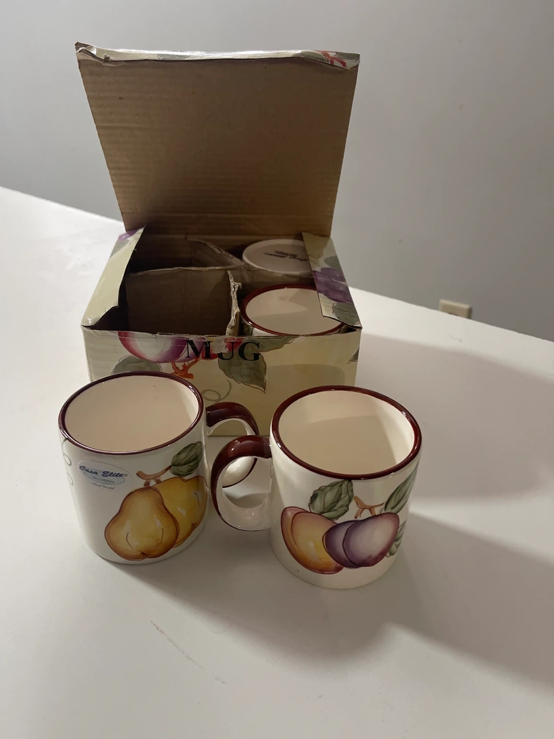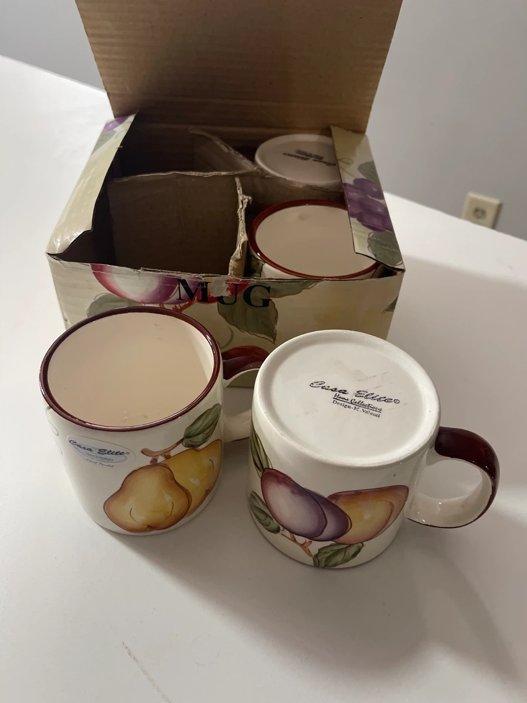 Set of four ceramic mugs with a fruit design. Each mug has a comfortable handle. Includes original box, perfect for gifting!