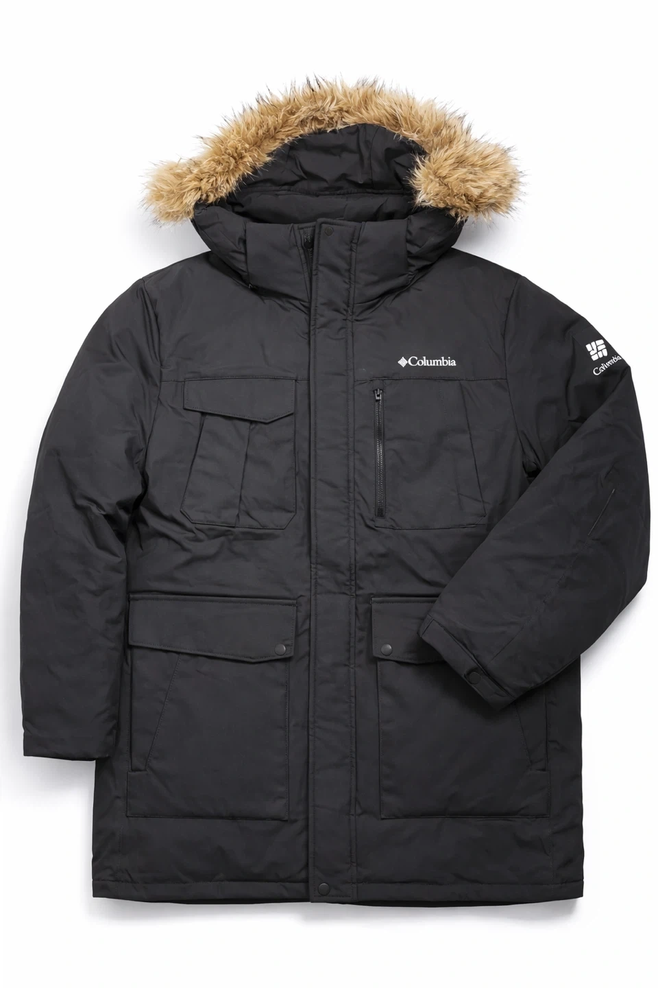 This Columbia parka jacket is designed for cold weather. It features a black outer shell with a faux fur-lined hood and multiple pockets for storage. Stay warm and stylish this winter!