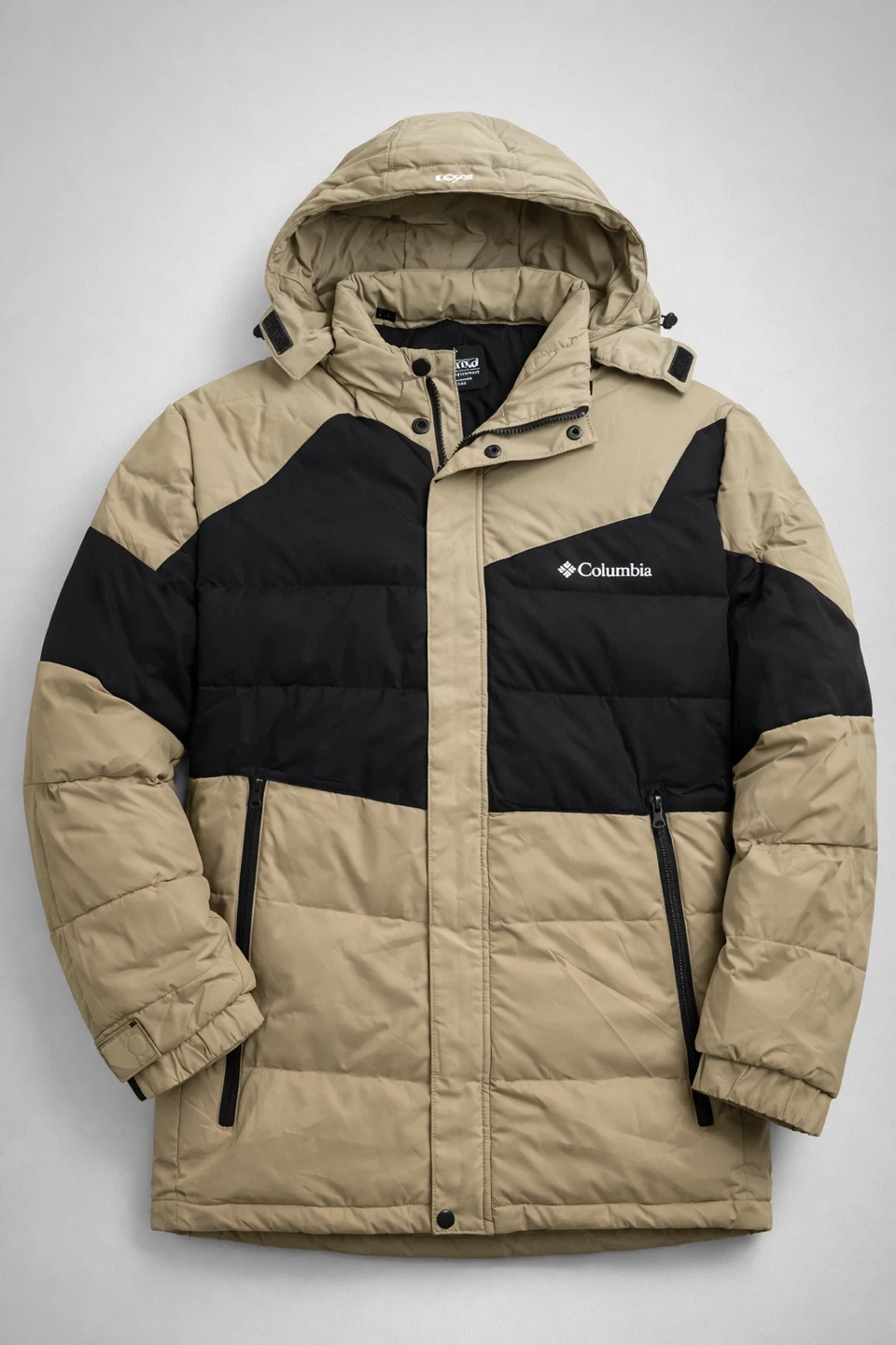 This Columbia parka jacket is designed for cold weather. It features a black outer shell with a faux fur-lined hood and multiple pockets for storage. Stay warm and stylish this winter!