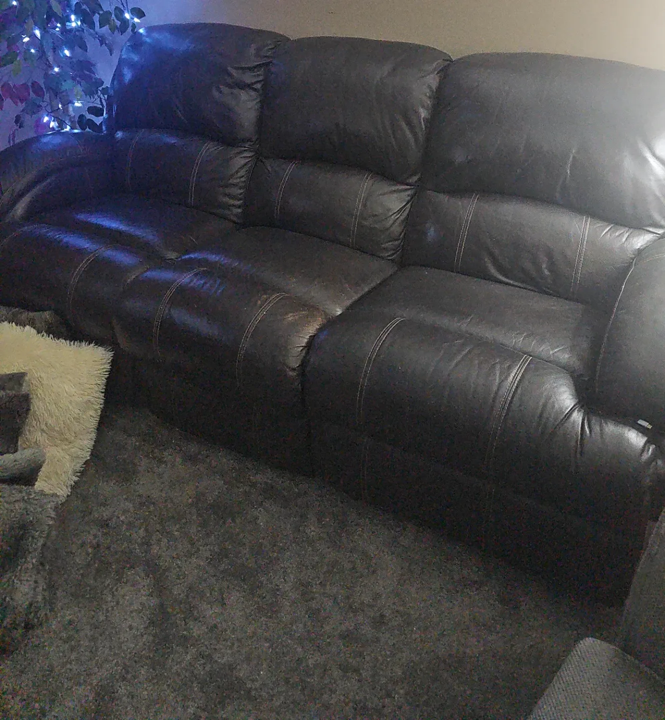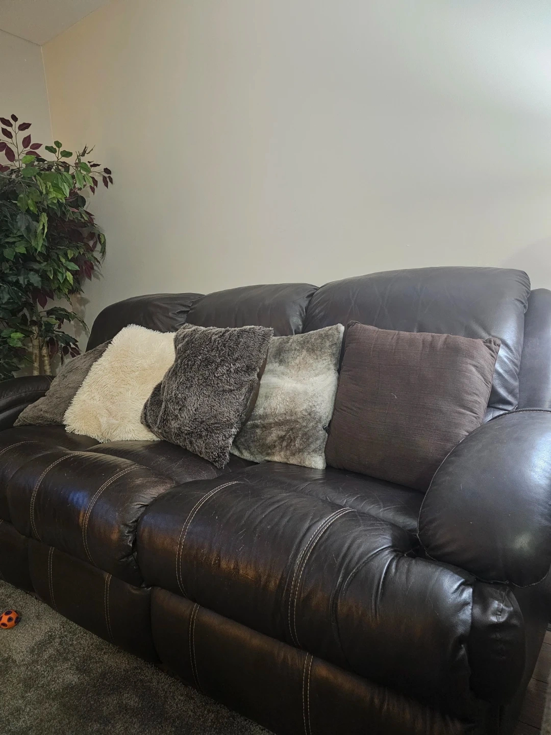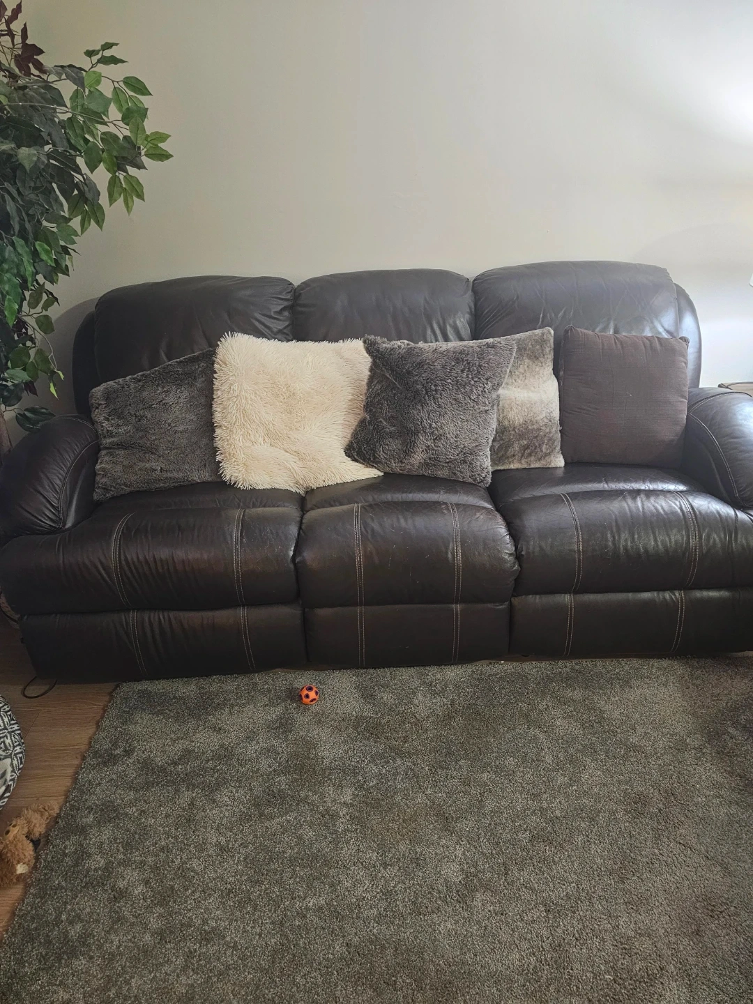 A dark brown leather couch. It seats 3 with x-wide seats. The outside seats are recliners and were never used. This couch offers a classic design that fits most living spaces. This is a Big Couch. There are no scratches, tears, marks on this couch. This is like new condition.