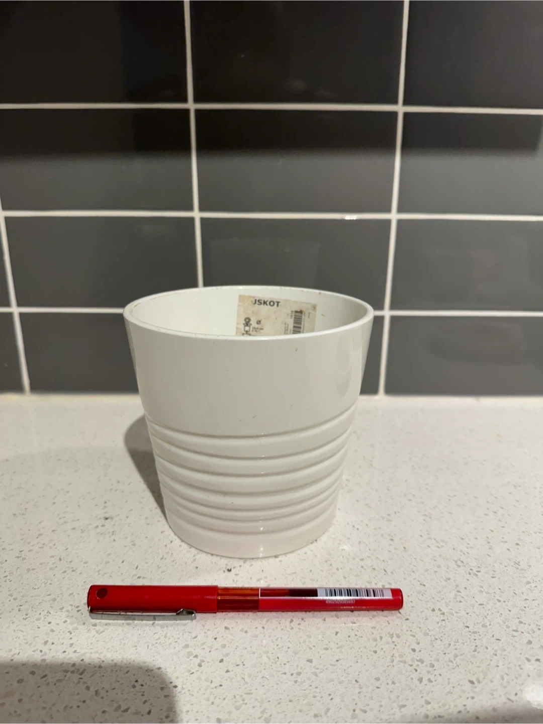 This is a white planter pot. It's made of ceramic and has a ribbed design. It's a handy size for small plants. I believe it originally came with an orchid