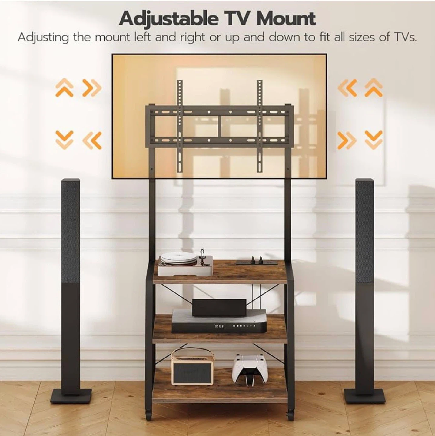 This Hoobro adjustable TV mount stand is perfect for your living room. It features three shelves for storage and it's adjustable for TVs of all sizes. The stand has a rustic wood finish and a black metal frame. It's on wheels for easy mobility!
