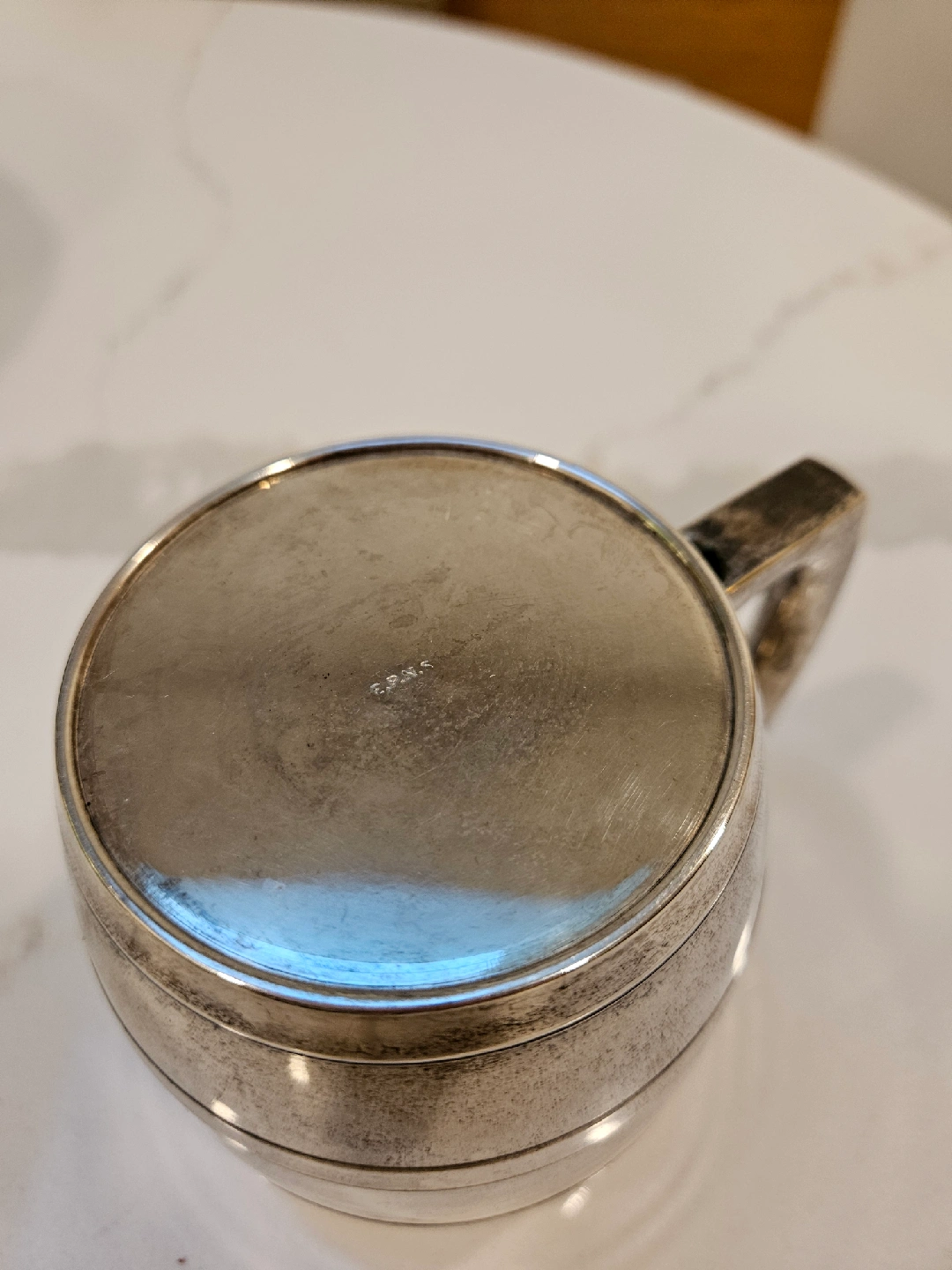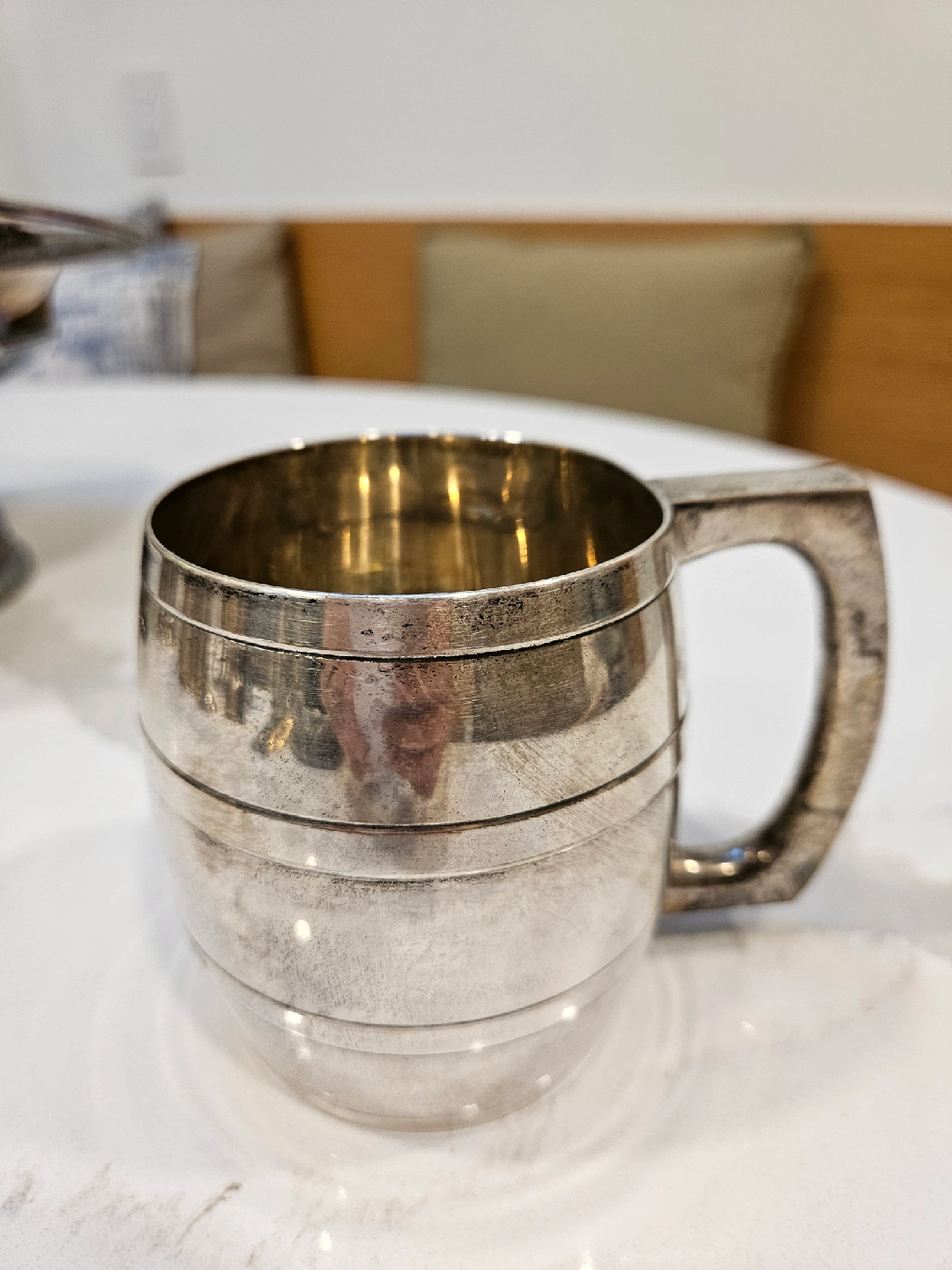 Selling a vintage EPNS silver plated mug. It has a unique barrel shape with a sturdy handle. Perfect for collectors or anyone who appreciates vintage tableware. There are some signs of wear consistent with its age, which add to its charm!